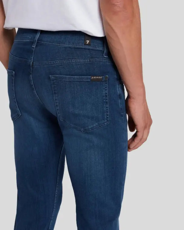 Find polished style in Slimmy Tapered. Cut with a slightly shorter inseam and a more tapered finish from knee to hem. Crafted from Luxe Performance Plus, offering a silky-soft touch, super stretch, and high recovery. This dark blue wash is marked with whiskering and a subtle fade down the thigh.