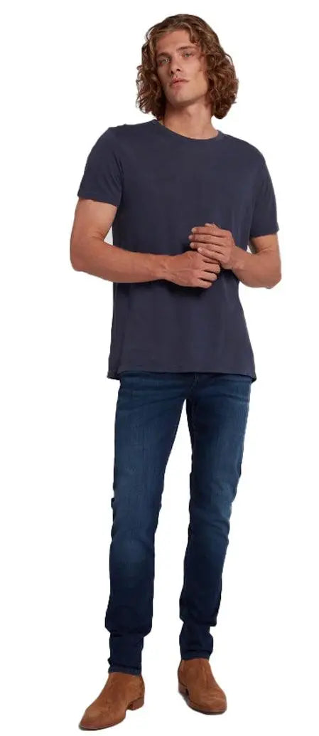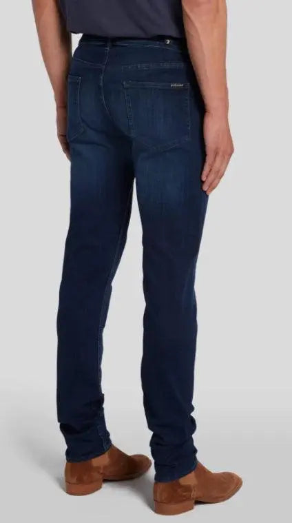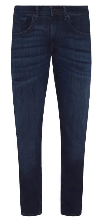 Find polished style in Slimmy Tapered. Cut with a slightly shorter inseam and a more tapered finish from knee to hem. Crafted from Luxe Performance Plus, offering a silky-soft touch, super stretch, and high recovery. This dark blue wash is marked with whiskering and a subtle fade down the thigh.