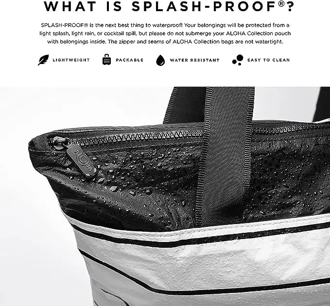 • SPLASH-PROOF is the next best thing to waterproof! Your belongings will be protected from a light splash, light rain, or a cocktail spillage, but please do not submerge your ALOHA Collection pouch with belongings inside. The zipper and seams of ALOHA Collection bags are not watertight.