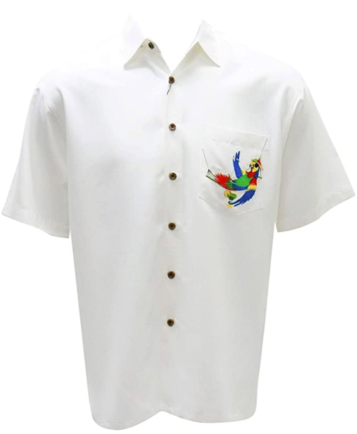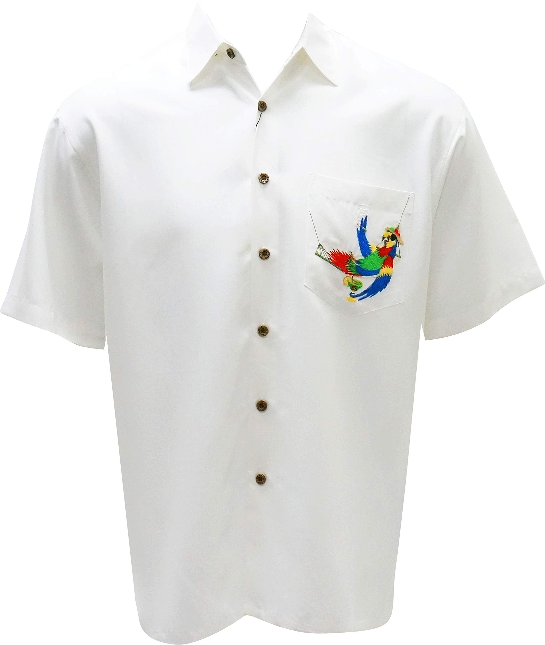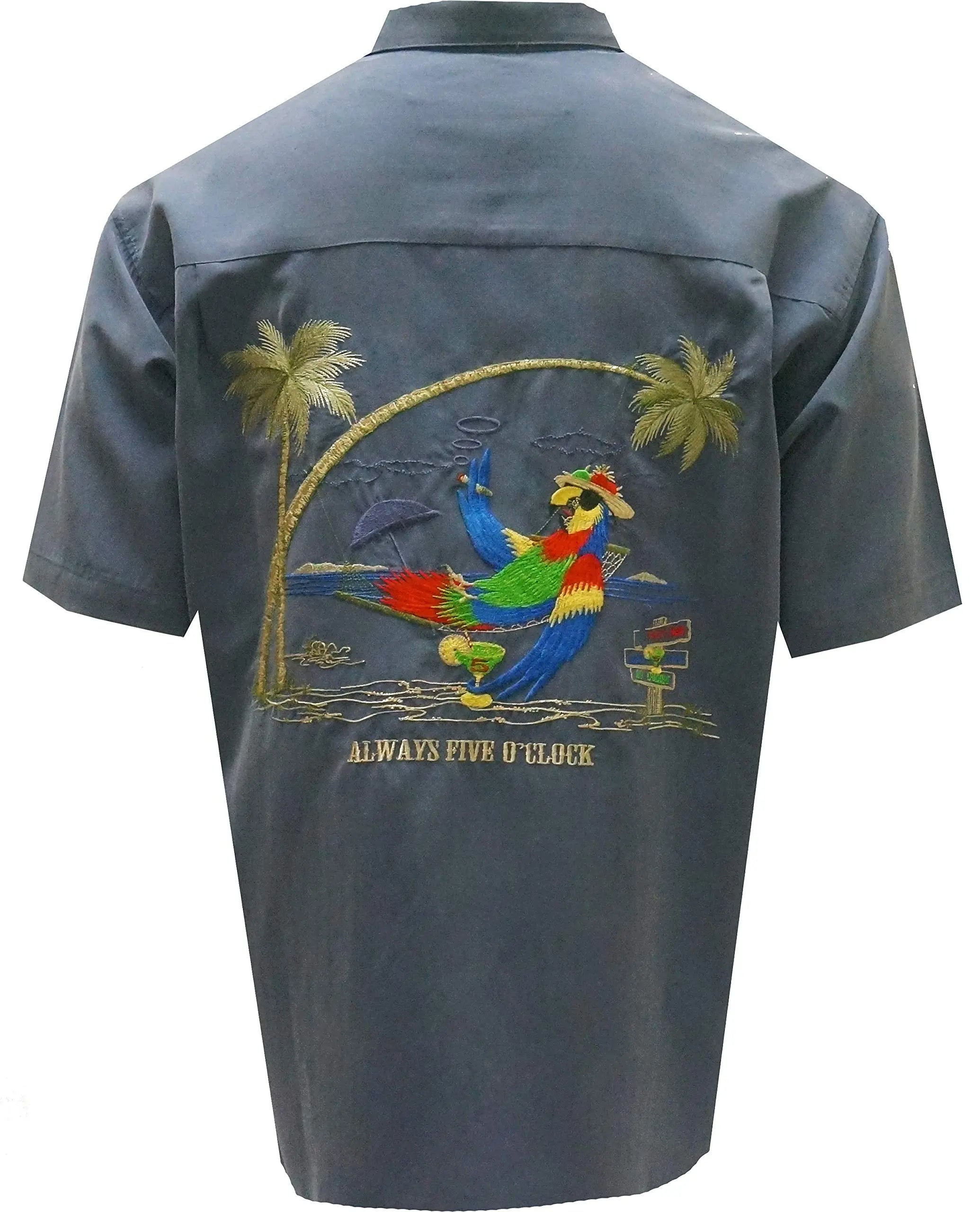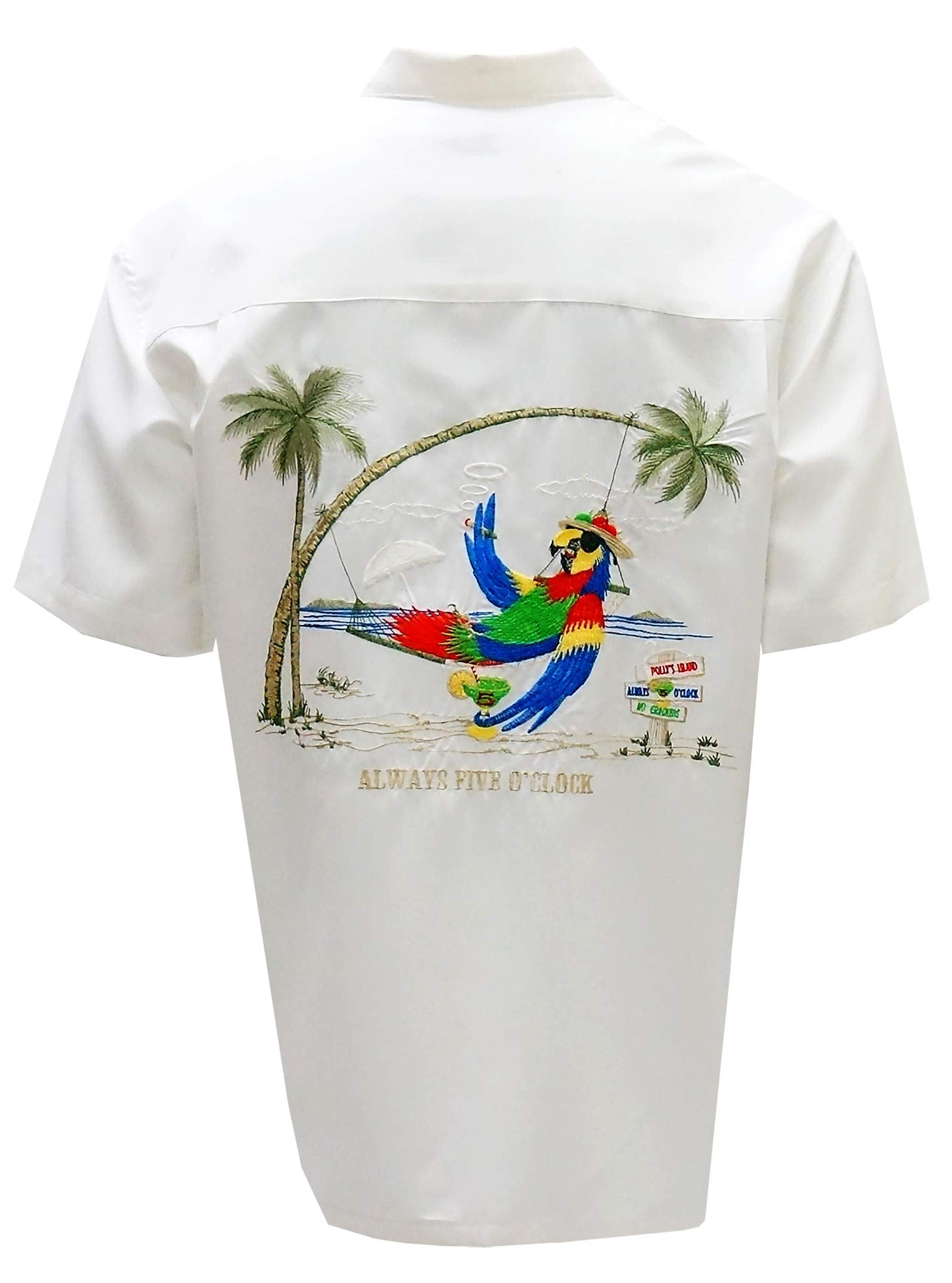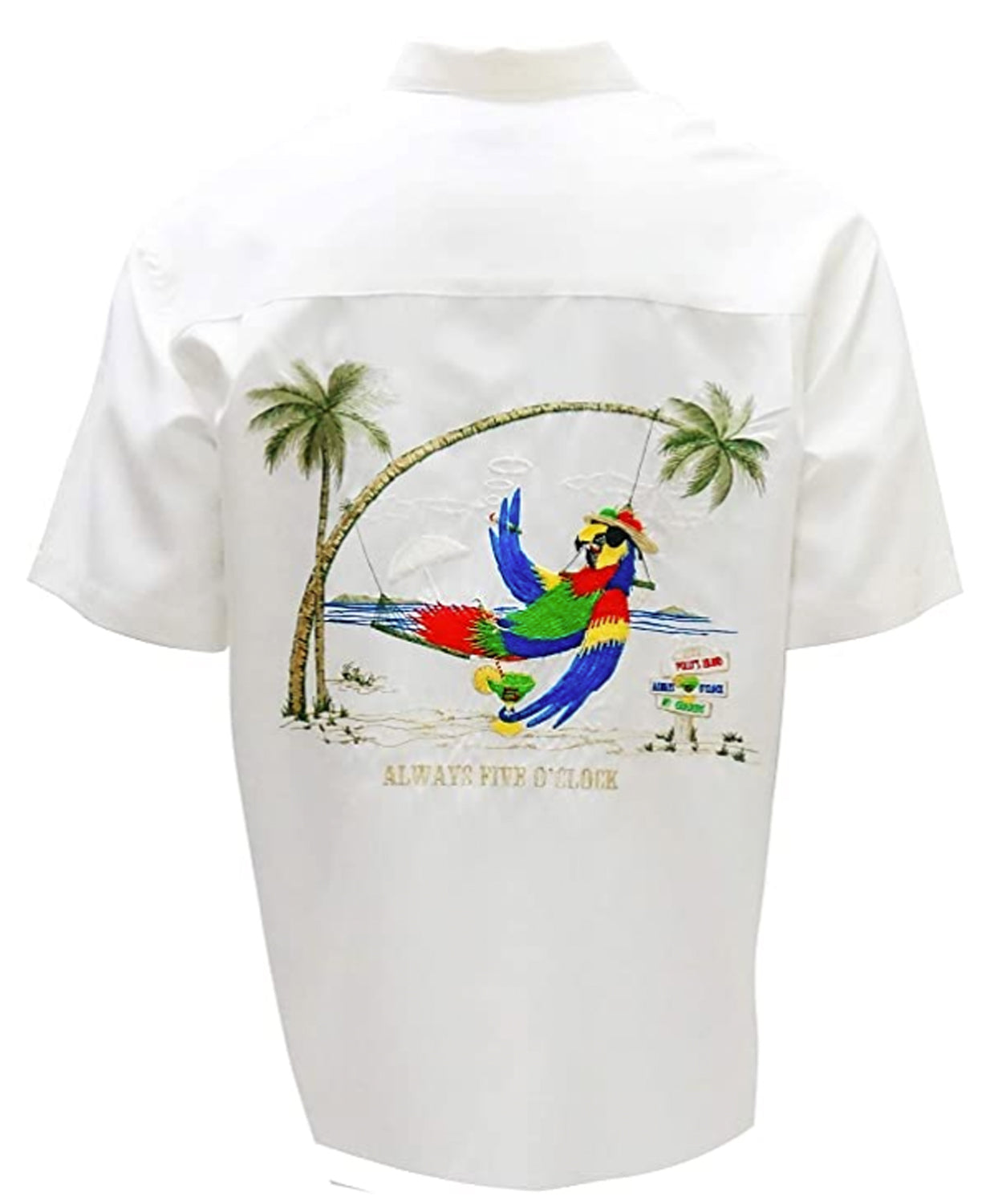 Always 5 O'Clock is a short sleeve back embroidered camp shirt featuring a parrot relaxing and enjoying his time in Bamboo Cay's paradise island. Over 100,000 stitches! Bamboo Cay will get you noticed without drawing attention to yourself.