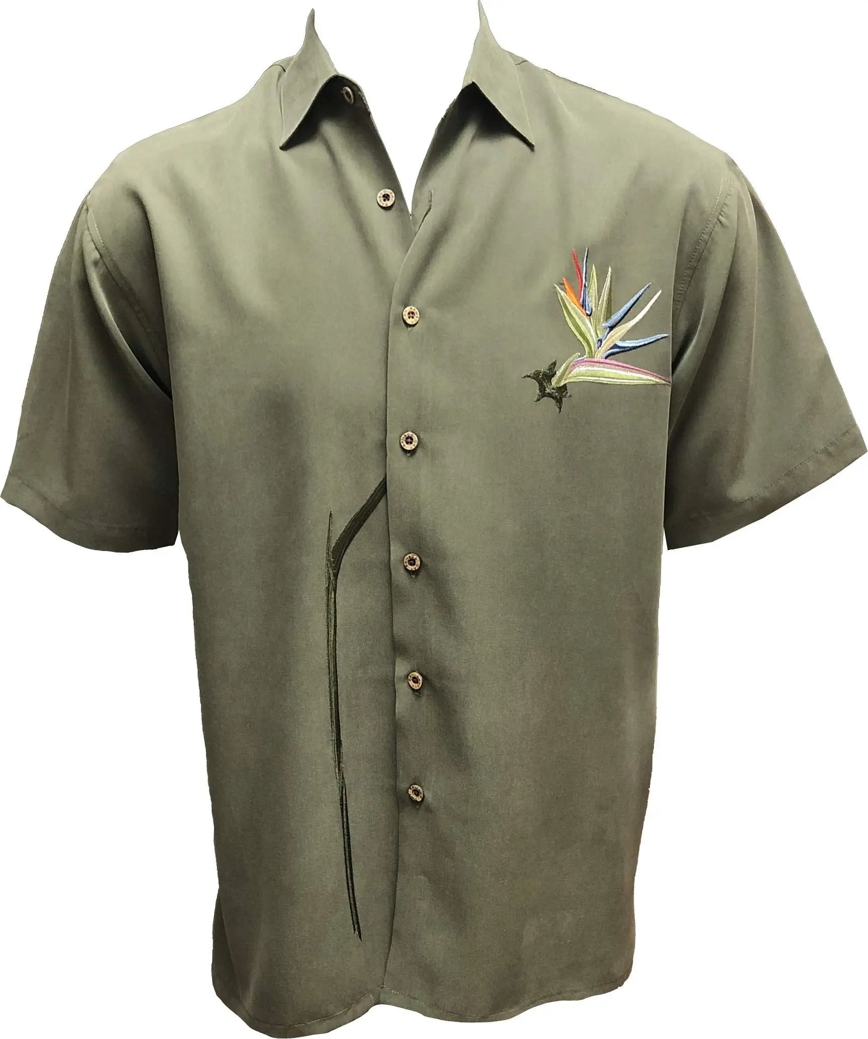 Front embroidered camp shirt featuring a tonal Bird of Paradise stem embroidered on the wearers right side towards underneath the placket and an embroidered colored Bird of Paradise flower on the wearers left side, designed with the idea that it is tearing out of the shirt.