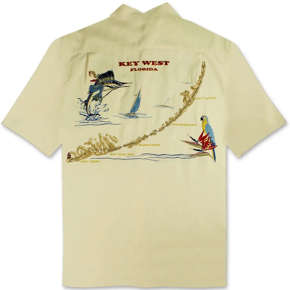 Short sleeve back embroidered button-down shirt featuring the map of Key West and all of its major cities embroidered with a colorful sailfish and mermaid on the left-side.