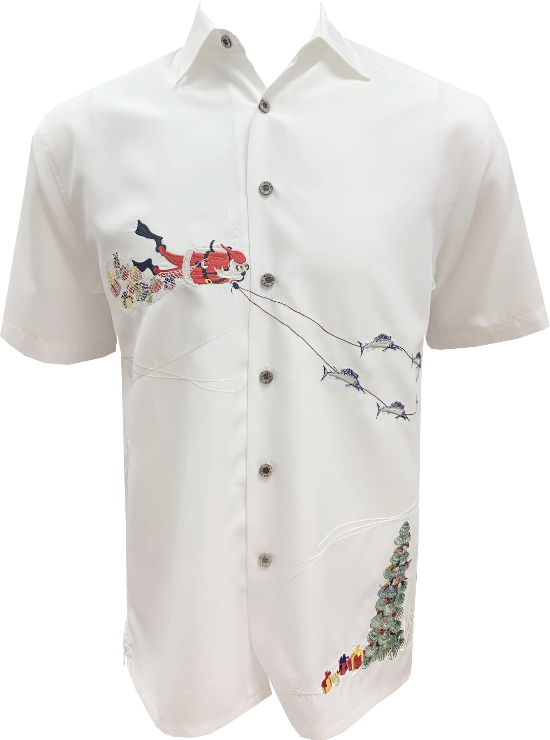Christmas vacation shirt with a unique design: Through our unique artwork, we tell the story of Scuba Santa who plunges into the deepest corners of the Bamboo Cay paradise island so he could surprise the Bamboo Cay fishes as well as other sea animals with gifts and spread the Christmas cheer.