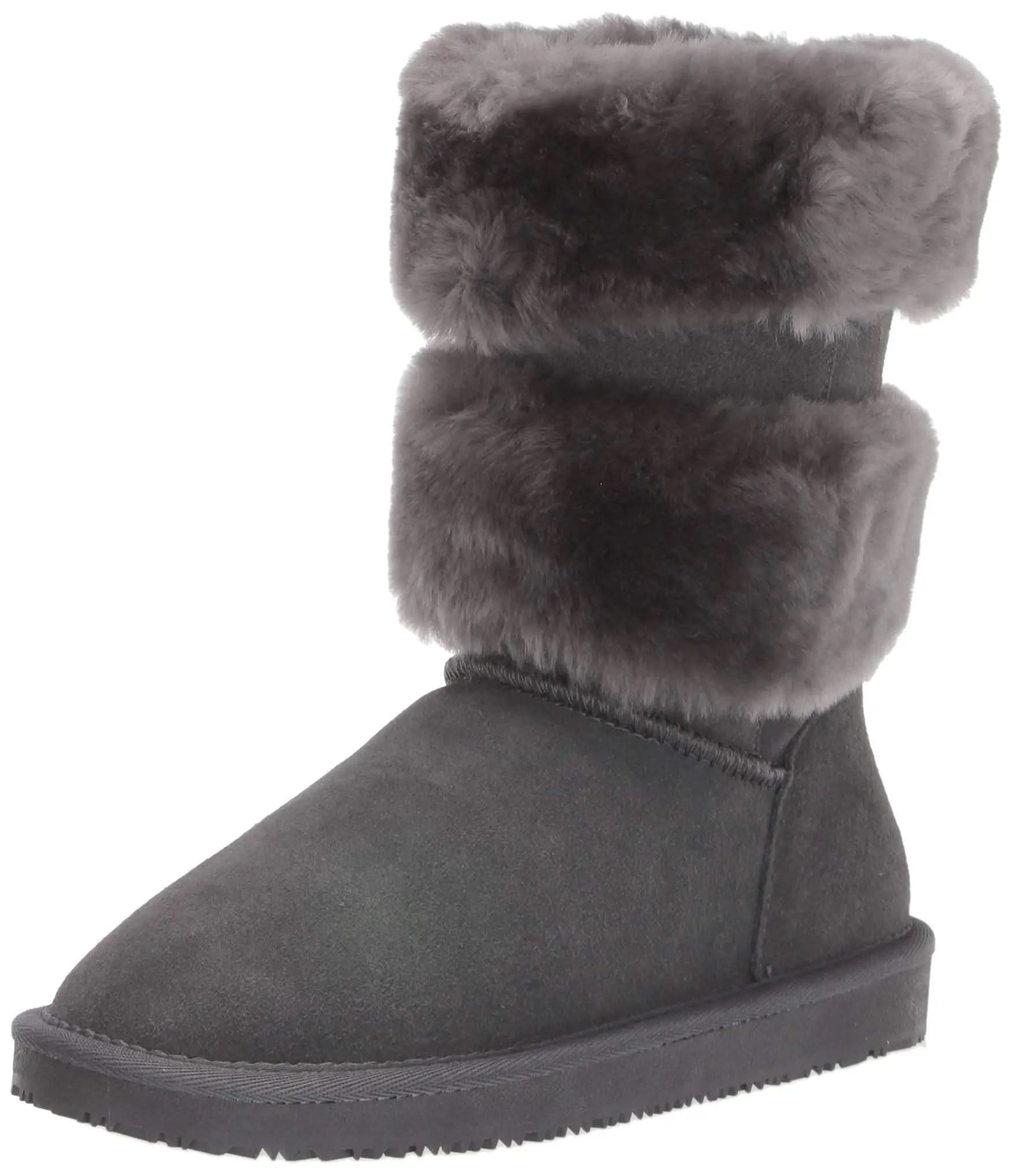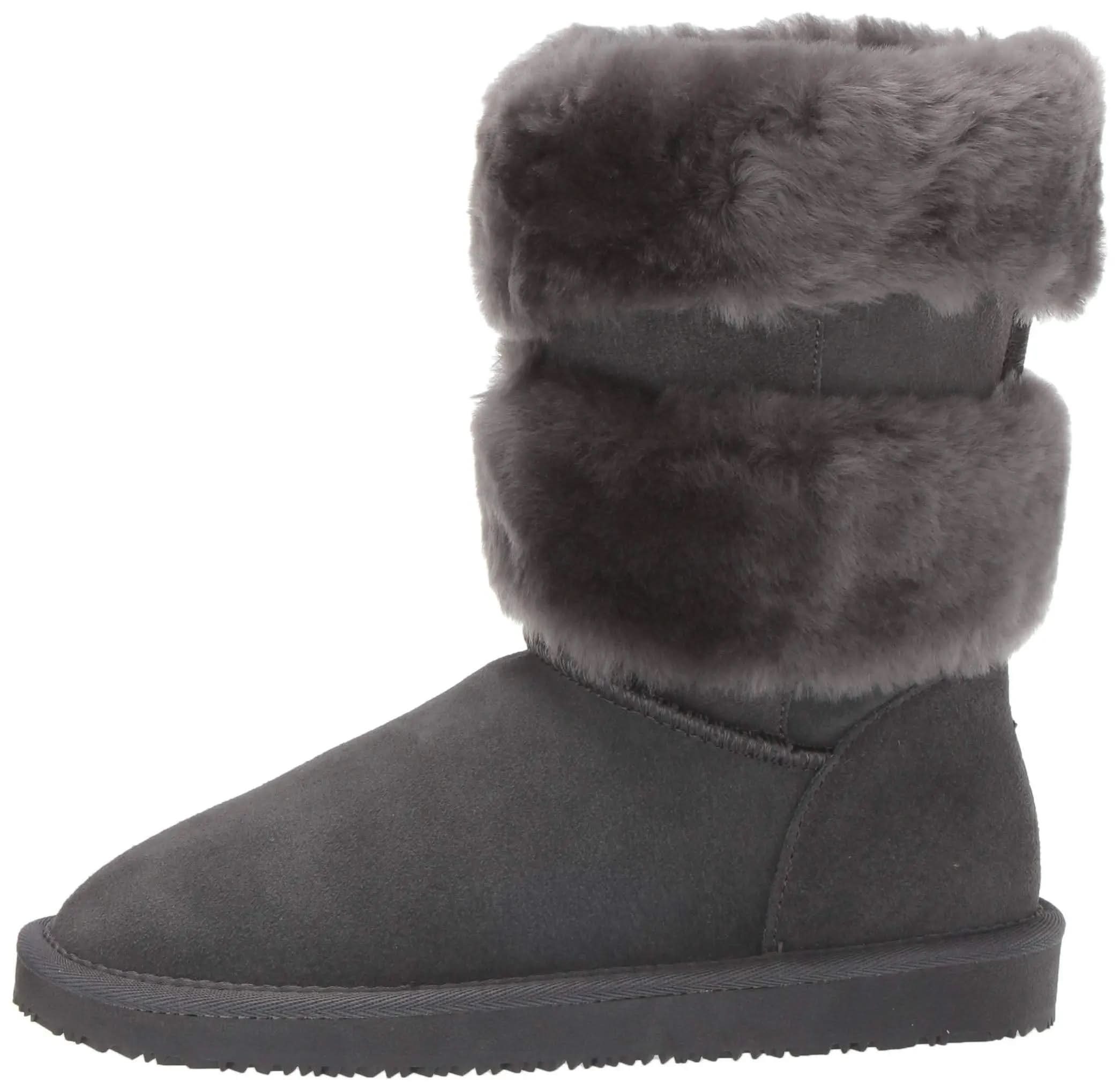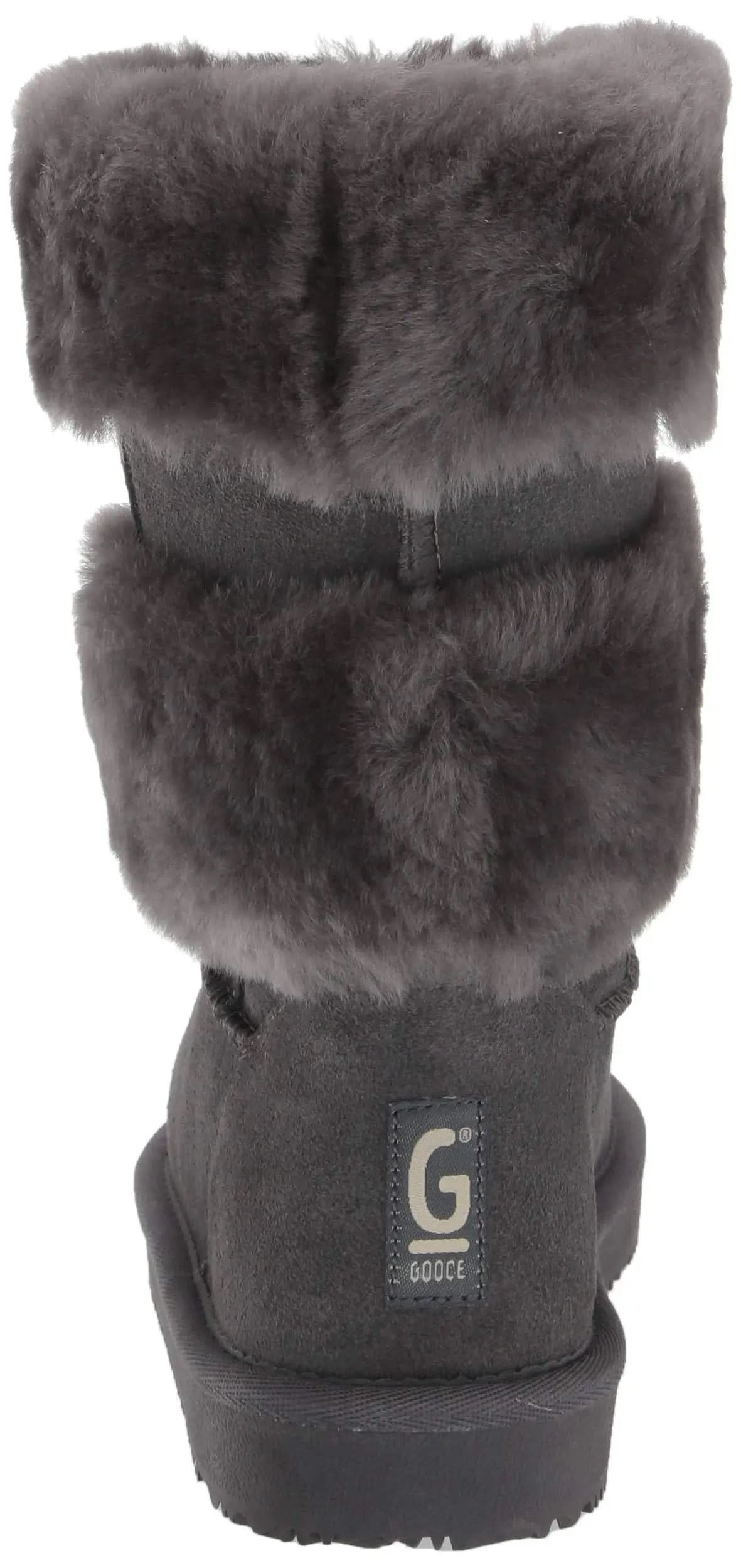 100% suede upper, 3 fashion rings of shearling around the boot, shearling lined and rubber outsole.