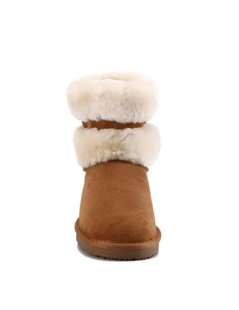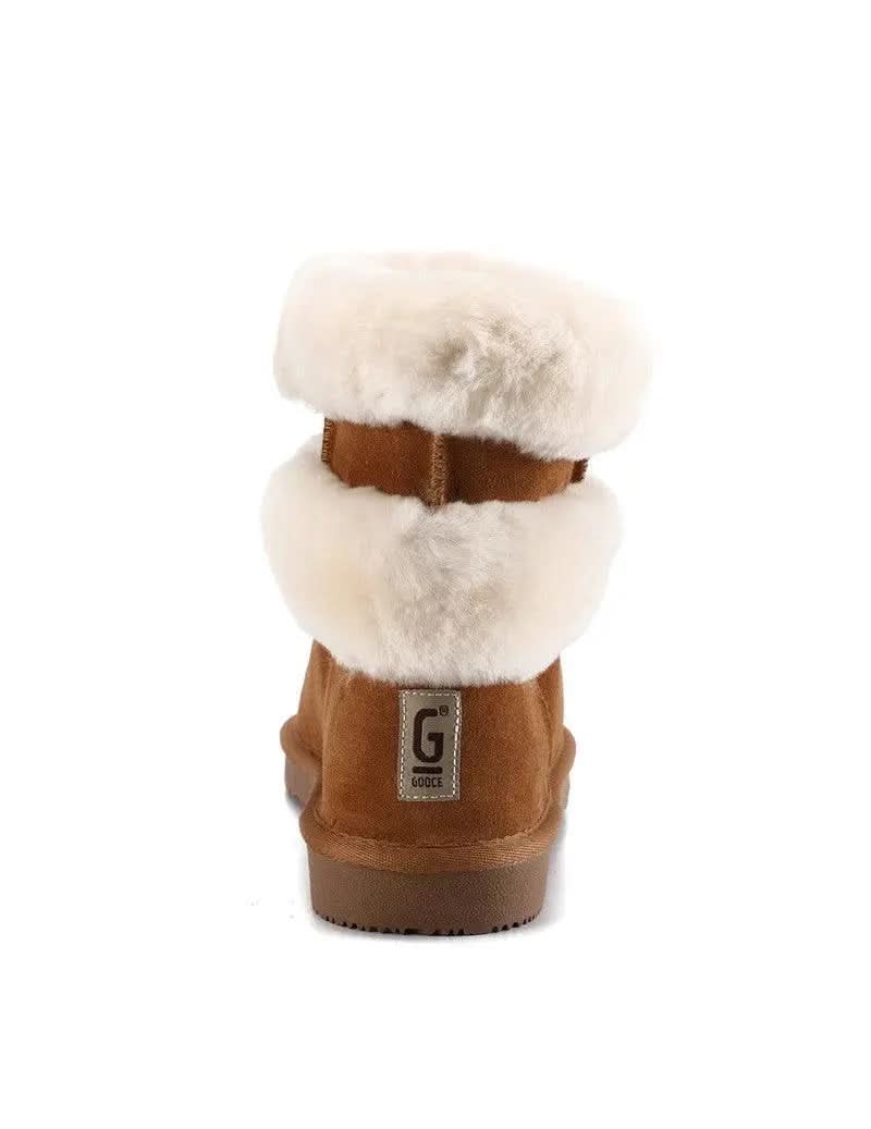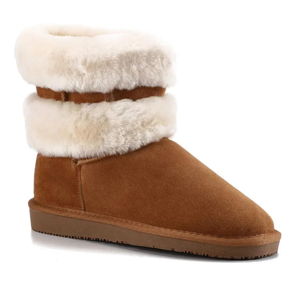 100% suede upper, 3 fashion rings of shearling around the boot, shearling lined and rubber outsole.