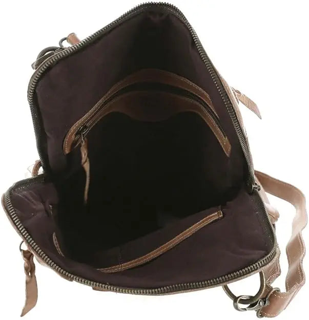 - Metal zippers with leather pulls and security tabs