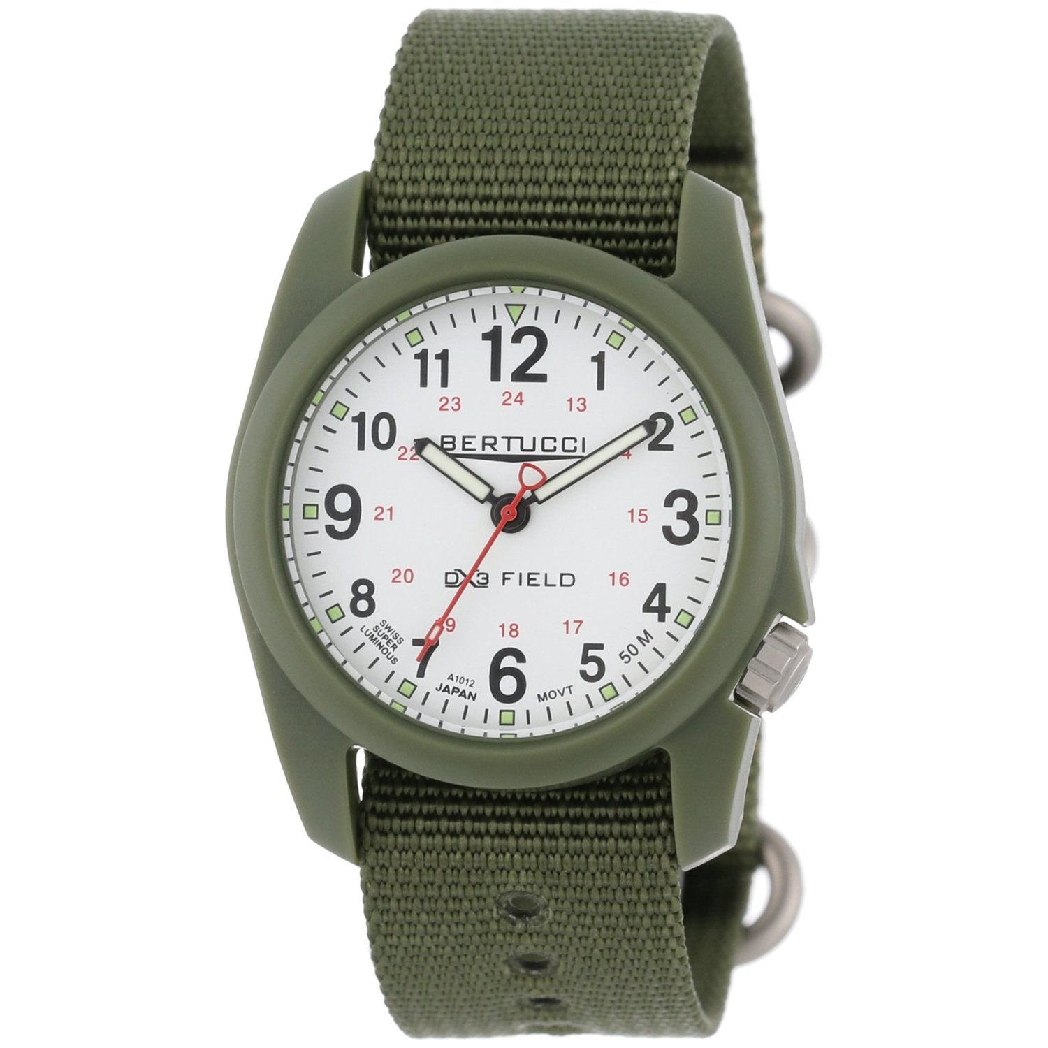 The DX3 Field offers classic design, a rugged U.S. Patented Unibody fiber reinforced 40 mm case and a long list of performance features... including a scratch resistant R-Type mineral crystal, offset ergonomic crown, long lasting precision movement, 3 year battery, 50 M water resistance, B-Type nylon webbing band, and Swiss super luminous hands & markers. The easy to read dial and comfort make the DX3 a great to go to watch.