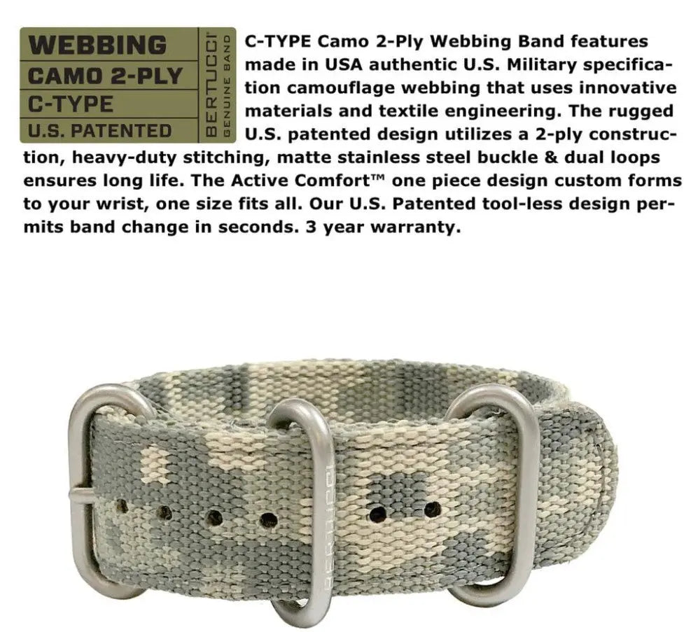 B-TYPE Heavy-Duty Nylon Webbing Band offers long lasting durability and comfort unmatched in the marketplace. Featuring military spec. nylon webbing, heavy-duty stitching, and solid stainless steel buckle and dual loop keepers. The Active Comfort one piece design is equipped with the Fold and Tuck excess band retention feature and wide adjustment range to ensure a perfect fit for all wrist sizes.