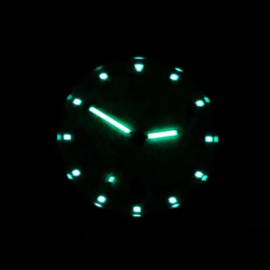 Dial Luminosity: The hands and markers are treated with high performance Swiss Super Luminous material that will intensely glow for hours based on exposure to sunlight or indoor lighting... not requiring a button push (a weak point), and will not deplete battery or require two hand operation.