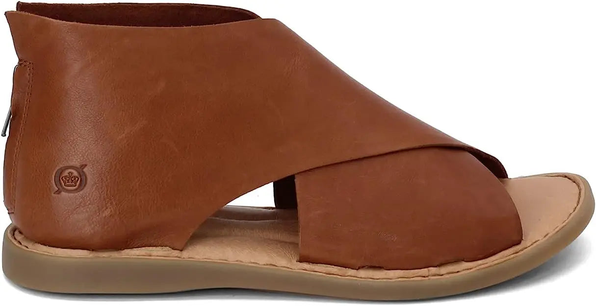 Women's Born, Iwa Sandal. This simply styled leather wrap sandal looks great with almost any outfit. The soft leather uppers offer optimal foot coverage, making this the perfect sandal to transition between seasons. Full-grain leather uppers are super soft and will wrap your foot in comfort Micro suede linings for a luxurious feel Opanka handcrafted construction Leather-covered cushioned footbed Closed back design with zipper for easy on and off Rubber outsole with a swirl traction pattern design. Heel Height of 0.50 inches
