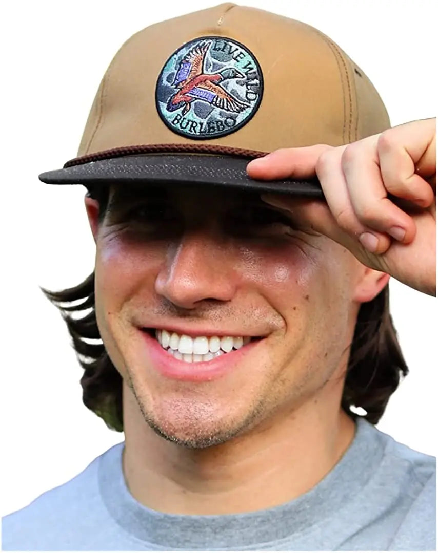 The cap is designed with a slightly curved bill, Low Profile 5 Panel Snapback Rope Cap with a Retro Camo Patch (Duck Embroidery).