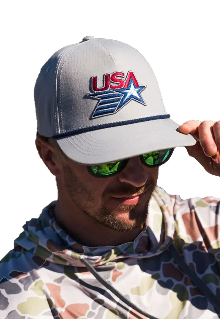 The cap is designed with a slightly curved bill, an embroidered USA Retro Star patch at the front, and adjustable snapback closure.