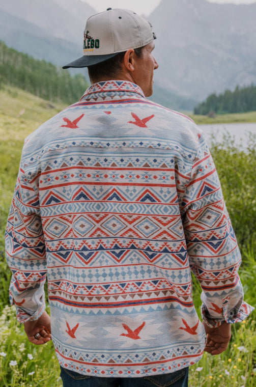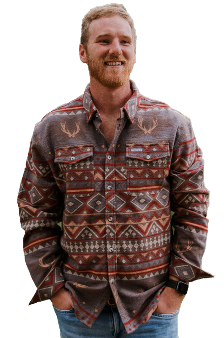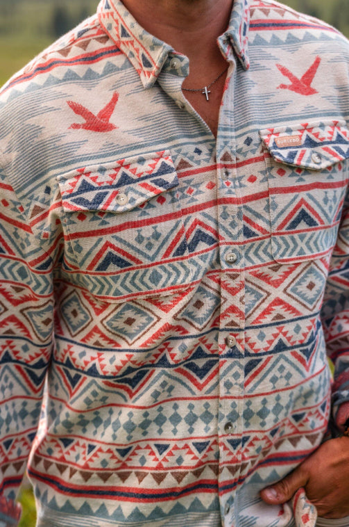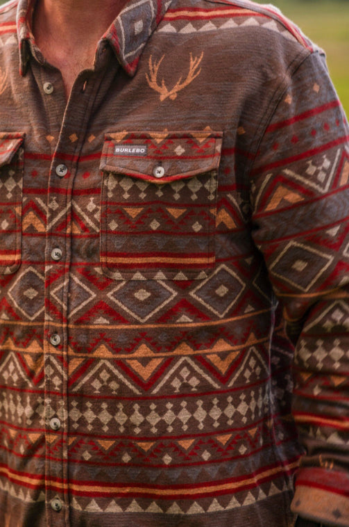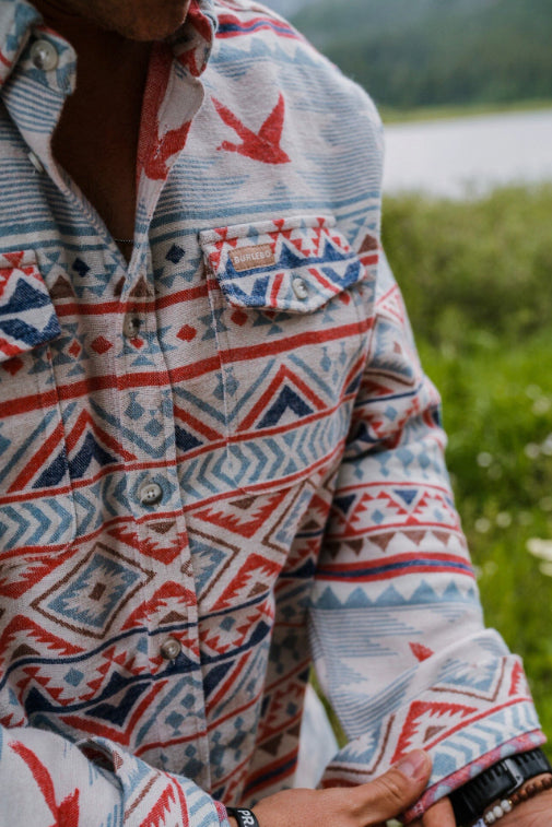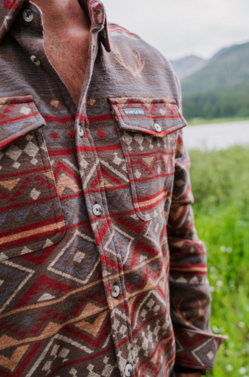 Featuring distinctive front pocket button closures and a button sleeve placket with adjustable cuffs, this piece adds a touch of detail to your everyday style. Whether layered or worn solo, this exclusive Aztec Twill is designed for those who appreciate craftsmanship, versatility, and standout style. Trey is wearing a size Large, standing at 6'1" and weighs 210 Pounds.