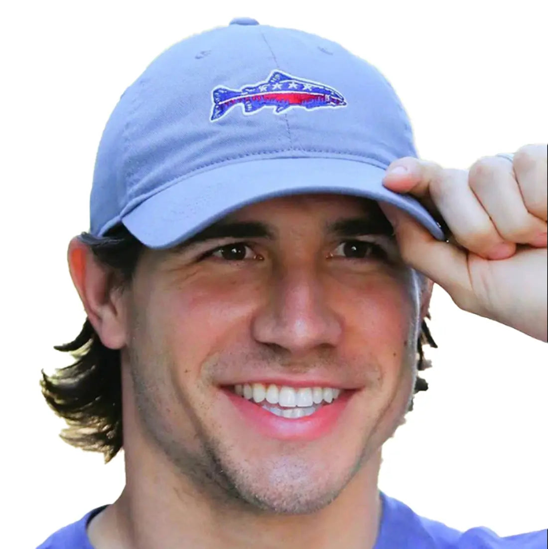 The cap is designed with a curved bill, an embroidered signature Patriotic Trout at the front, and adjustable canvas closure.