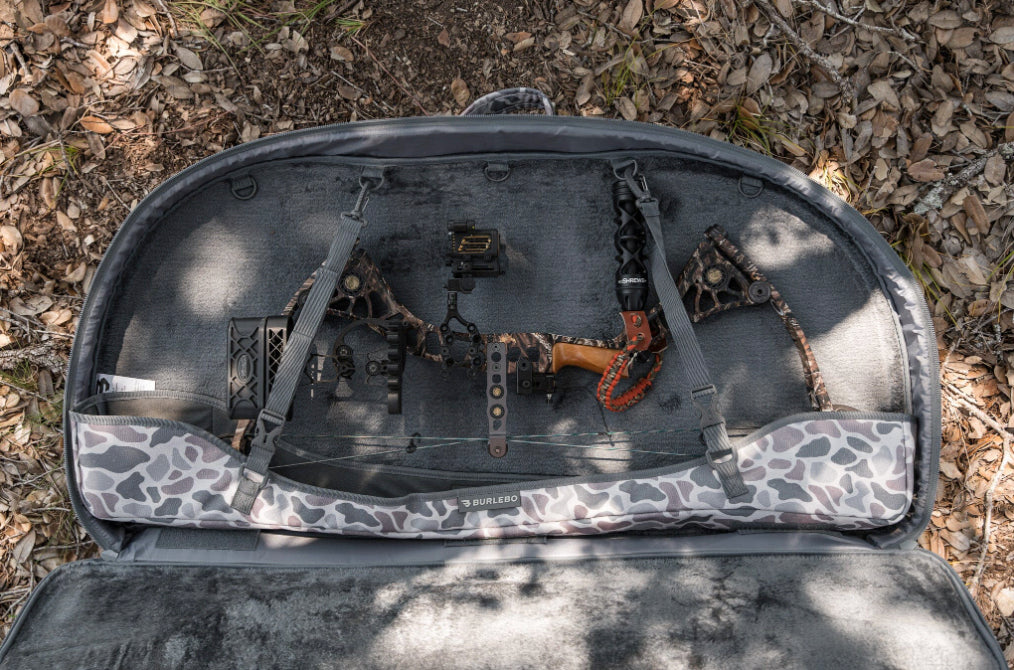 Main zippered compartment features a string and cam cradle with deep fleece lining and bow tie downs.