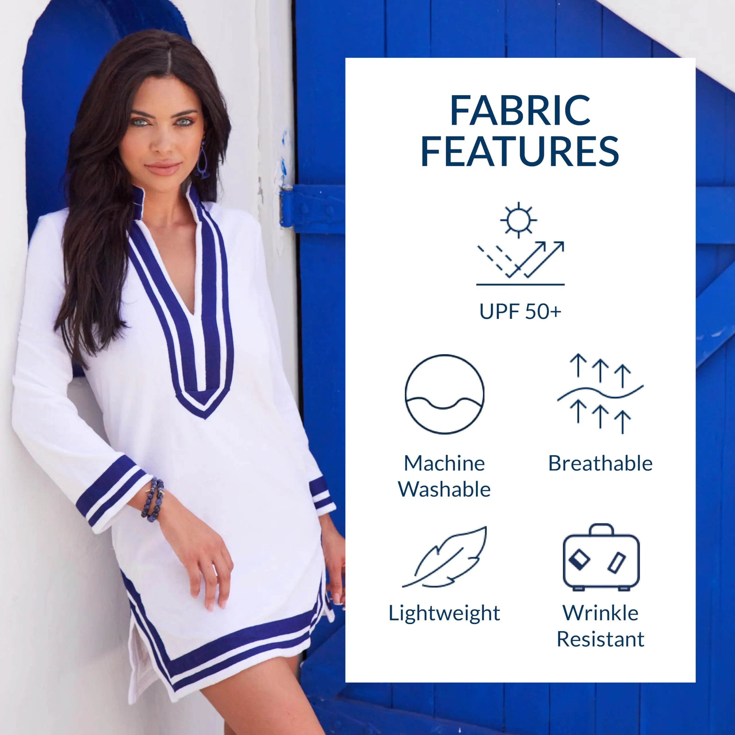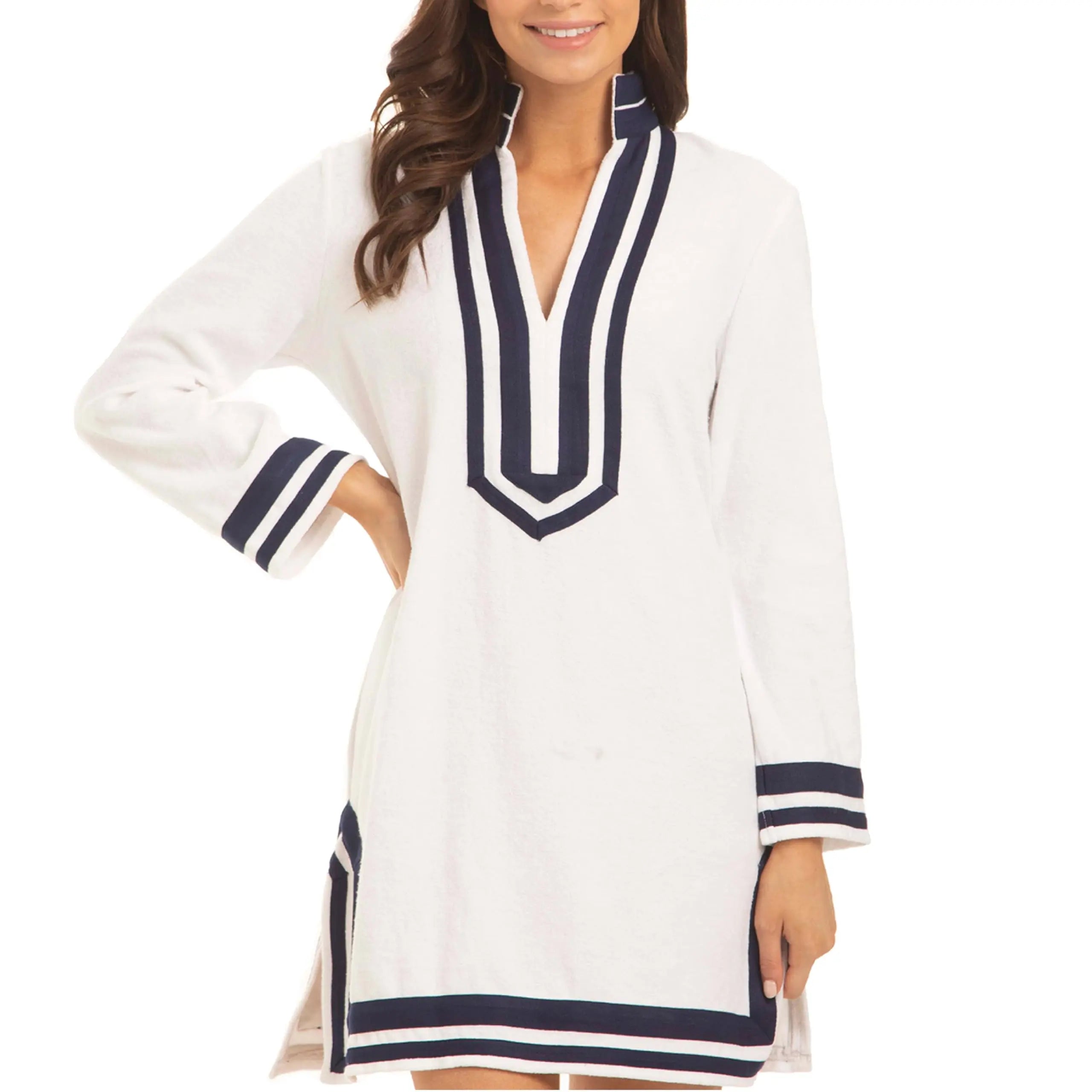 The sun safety never felt so cozy! This long sleeve white tunic features a navy trim to create a classic nautical look. Take it to the beach, on the boat, by the pool and out around town. Plus, the UPF 50+ cotton/poly terrycloth is so soft that you'll never want to take this off.