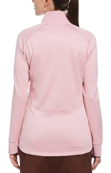 Comfort is par for the course with this cozy Callaway golf jacket. Soft, lightweight fleece combined with thermal fabric keeps you warm when playing in cooler weather. Added stretch lets you swing smoothly down the fairway, and a flattering fit has you looking stylish while you do it. The functional full-zip jacket features a mock neck and fitted cuffs for protection from the wind.