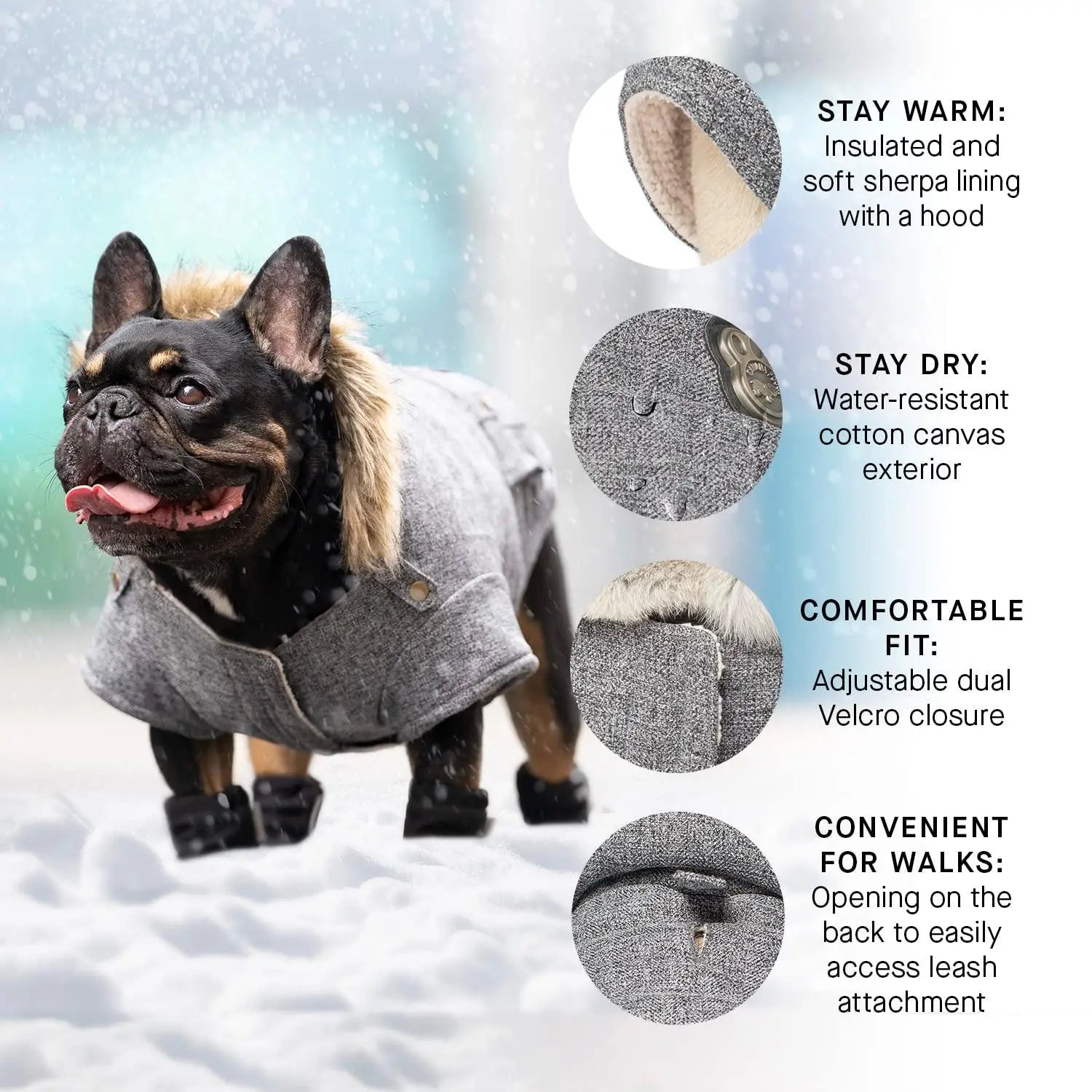 • WATER-RESISTANT: This hooded winter jacket for dogs is made with a water-resistant cotton canvas exterior. That means your pup will not only stay warm but also dry during those snowy dog walks.
