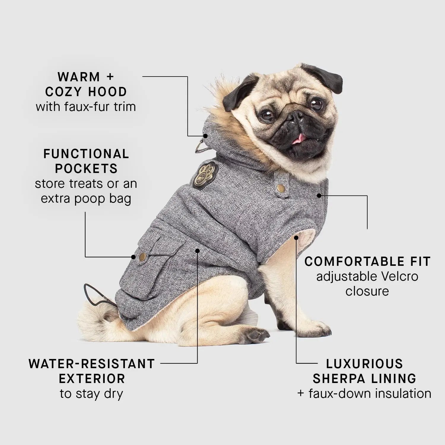 • FUNCTION & FASHION: Every dog deserves to look and feel great. That is why we are so proud of our dog jacket that combines fashion and function to keep your pup warm on winter days and fashionable with a faux-fur trim hood.