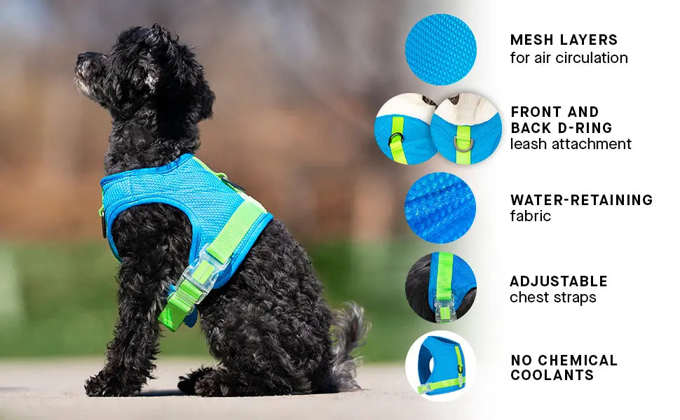 - Comfortable Mesh Layers - When we set out to create our cooling dog harness we didn’t want to compromise on your dog’s comfort! The material inside the vest has breathable mesh air pockets to allow air circulation. The outer shell contains 100% Polyester Mesh, while the interior material contains a blend of 80% Rayon & 20% Polyester. Our material is also chemical coolant free & the outer coat has reflective lining, which will keep your dog in sight during the day or night!