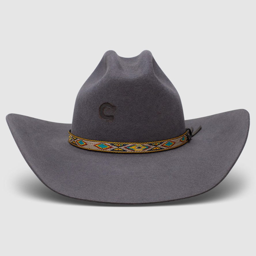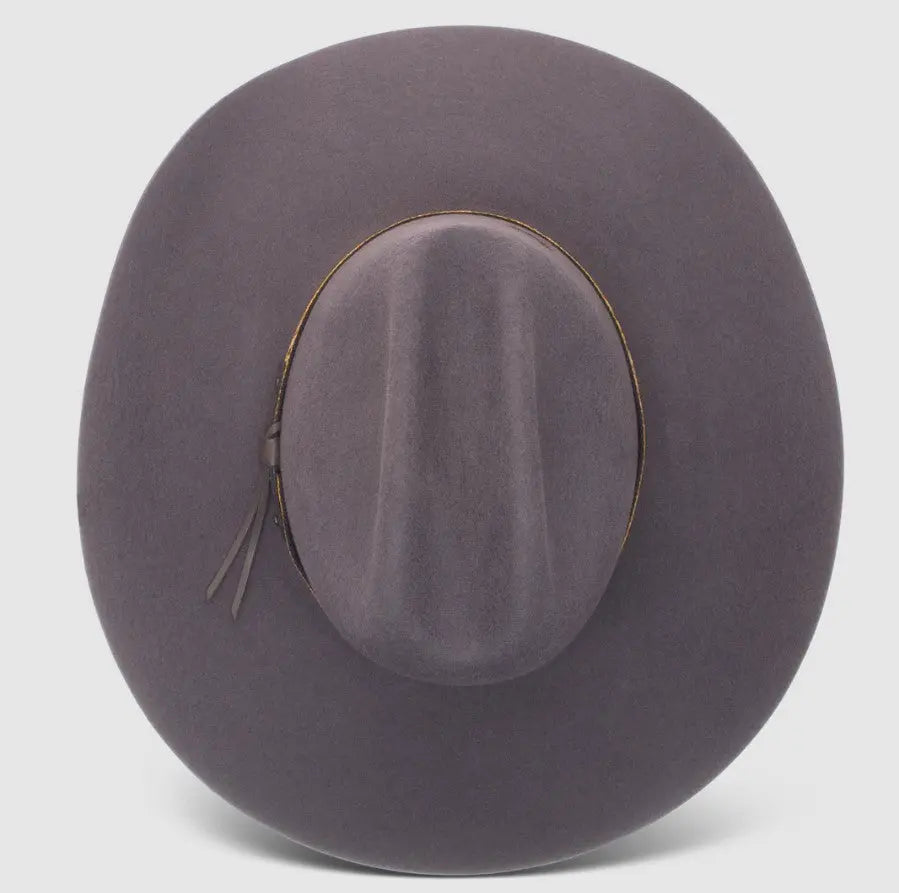 From the range to the ranch to the Austin city-limits sign, the Runaway Grey is a real smoke show. This wool hat comes in an F: 3 7/8â by B: 4 3/4" tapered cattlemanâs crown with a 4â brim. The resplendent blues, reds, and golds of the diamond hatband pattern look amazing against the grey, while an understated leather clasp adds subtlety and composure. The high-quality leather sweatband reminds you that the Runaway Grey is as much of a workhorse as it is a show horse. This hat is part of our Back At The Ranch Collection.