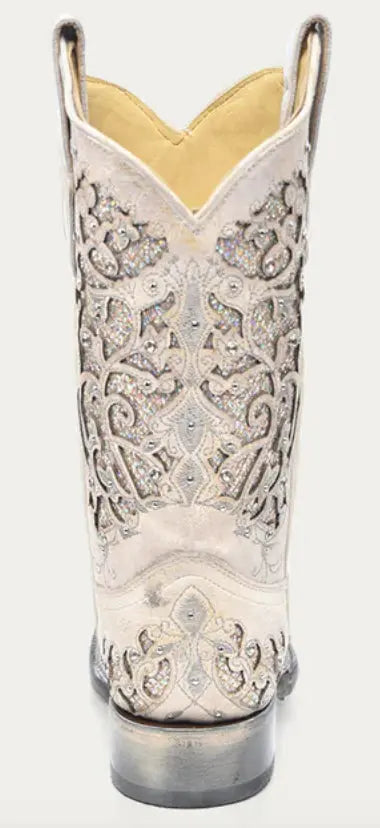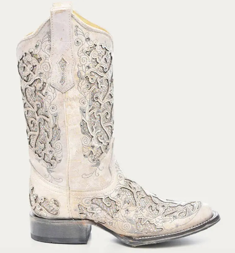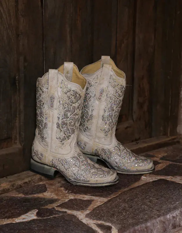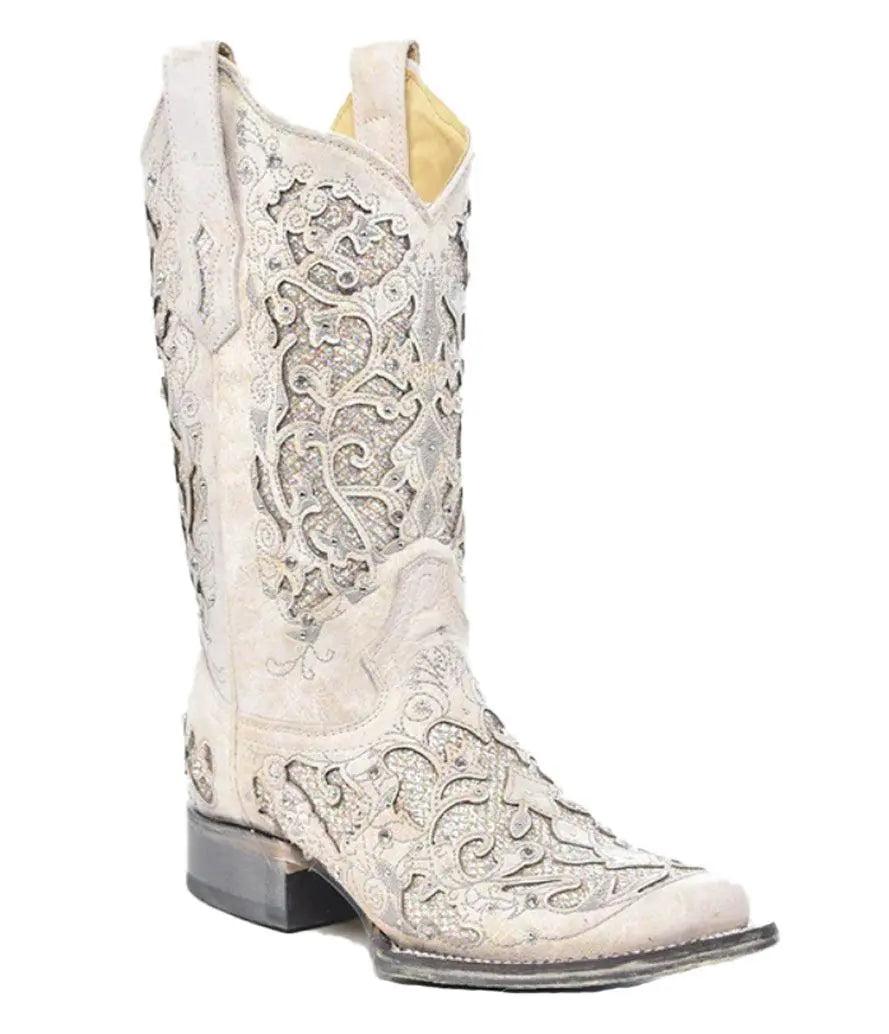 Its beauty is not only in its 11.5-inch shaft full of embroidery, glitter inlay, and rhinestones but also in its crackled leather finish, and in its white and dark grey weathered floral-designed sole.