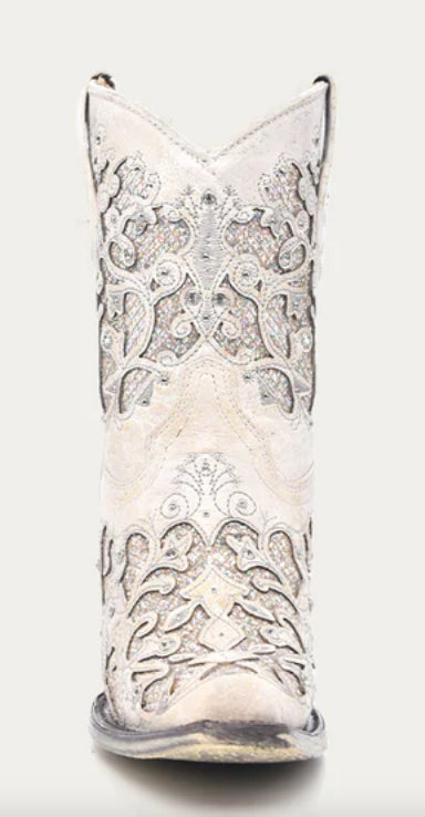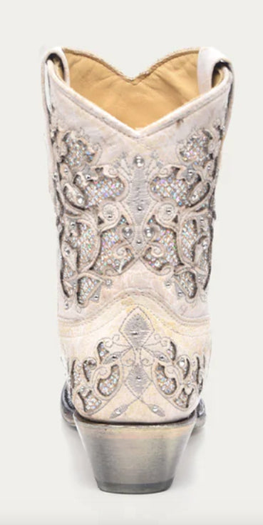 Delicate, coquettish, and chic. Beautiful white boot with glitter applications perfect for that special day.