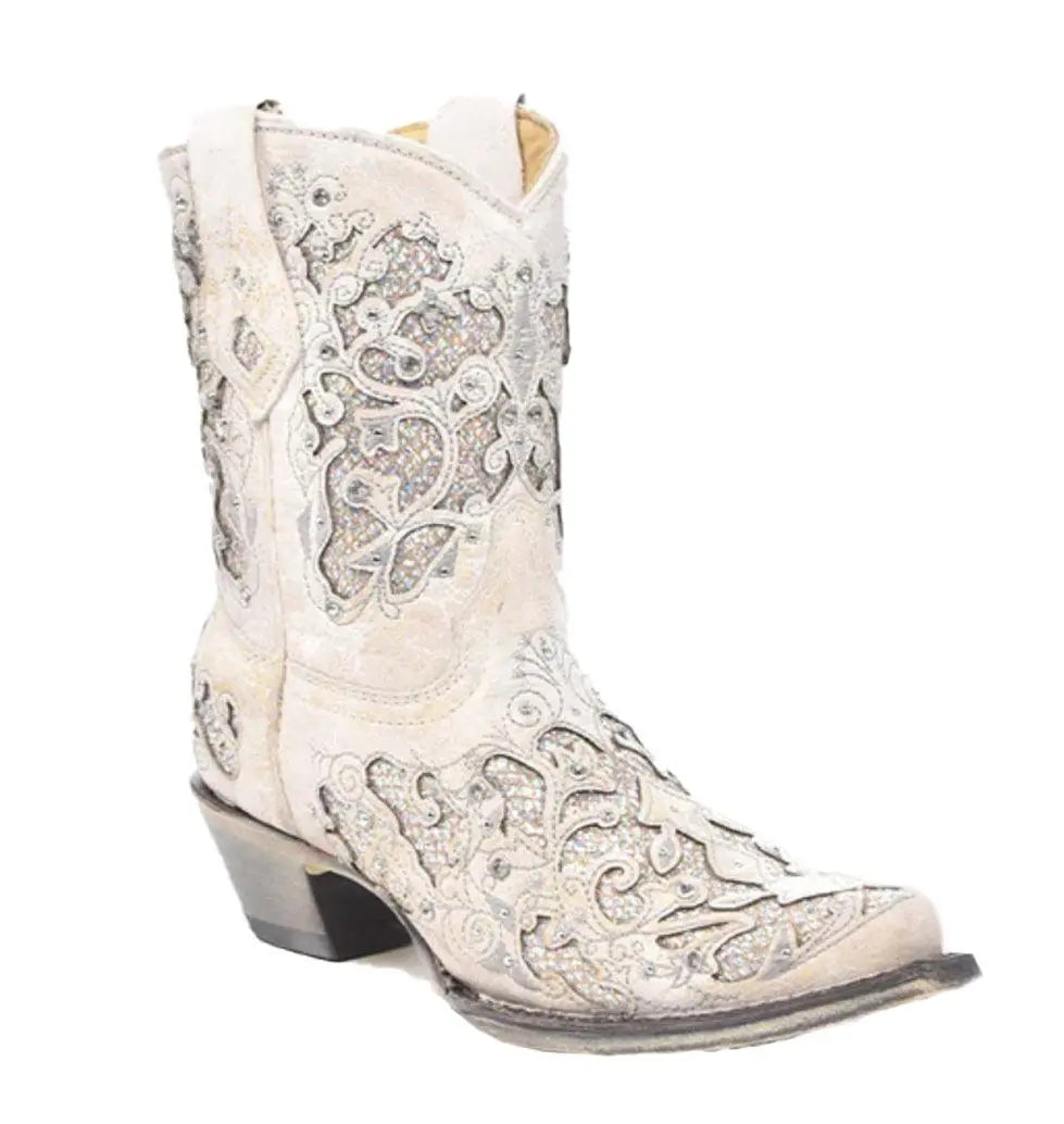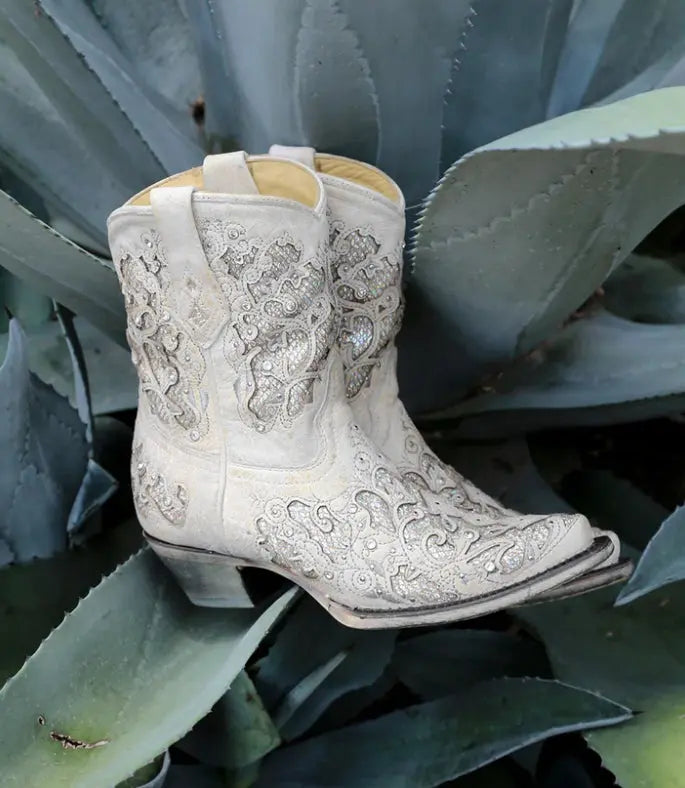 - EMBROIDERED INLAY COWGIRL BOOTS - Features intricate embroidery encompassing the inlay, surrounded by perfectly complementing crystals; toss these glitzy short Corral cowgirl boots on with your favorite sundress for a fun night out and tons of compliments