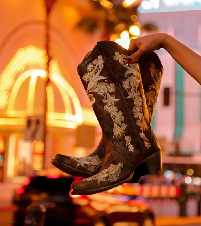 Classic, feminine, and fashionable. Grab everyone's attention with this stylish mix of distressed brown leather and flowered embroidery with crystals.