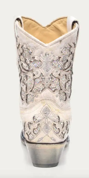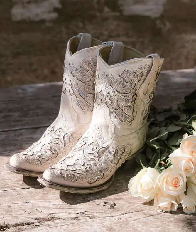 - EMBROIDERED INLAY COWGIRL BOOTS - Features intricate embroidery encompassing the inlay, surrounded by perfectly complementing crystals; toss these glitzy short Corral cowgirl boots on with your favorite sundress for a fun night out and tons of compliments