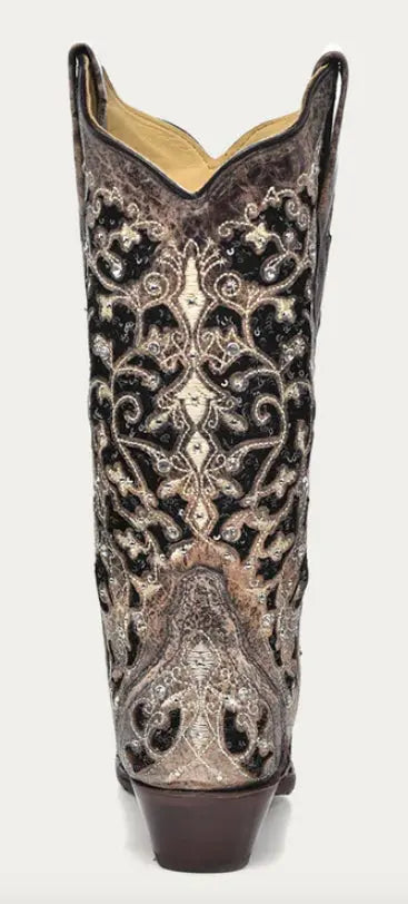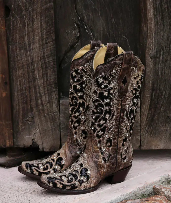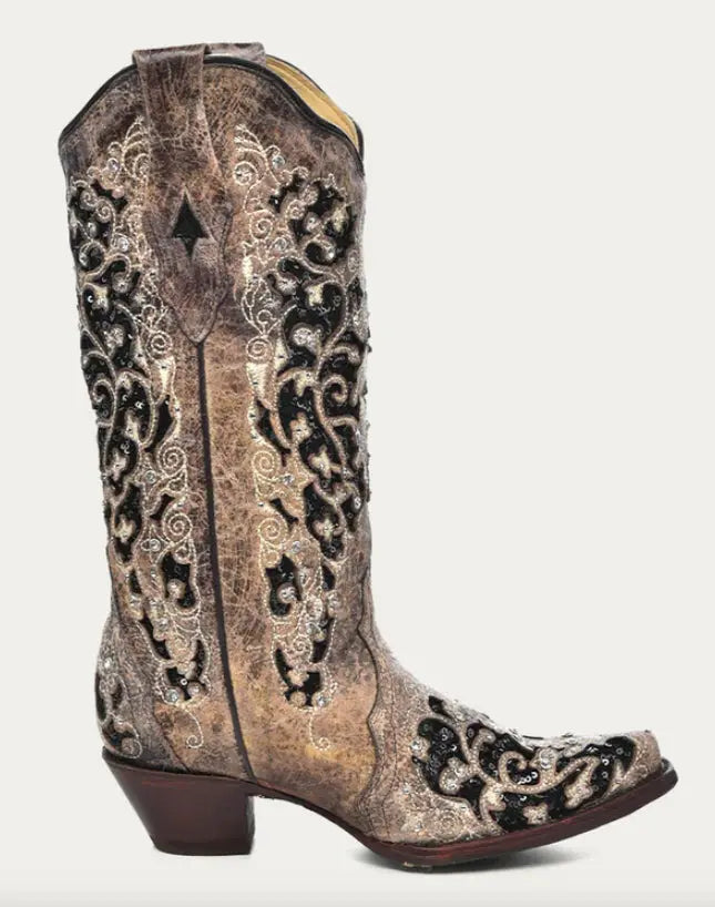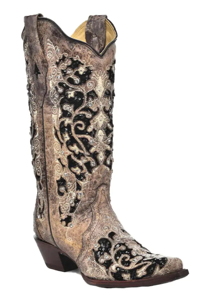 - INLAY COWBOY BOOTS FOR WOMEN - These Corral Glitter Western Boots are beautifully designed and perfect for a country wedding; they are decorated with Swarovski crystals and have an intricate glitter inlay design