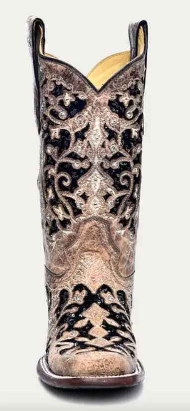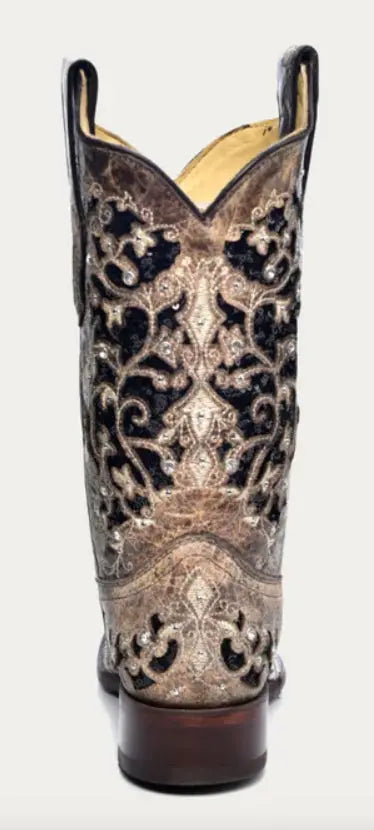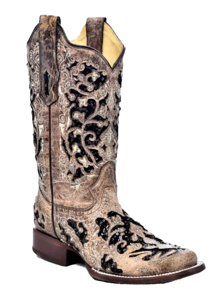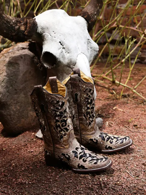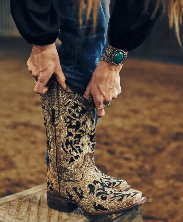 - INLAY COWBOY BOOTS FOR WOMEN - These Corral Glitter Western Boots are beautifully designed and perfect for a country wedding; they are decorated with Swarovski crystals and have an intricate glitter inlay design