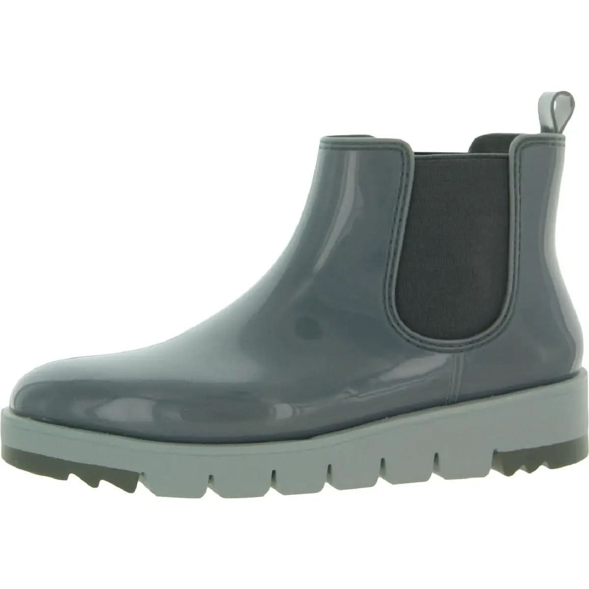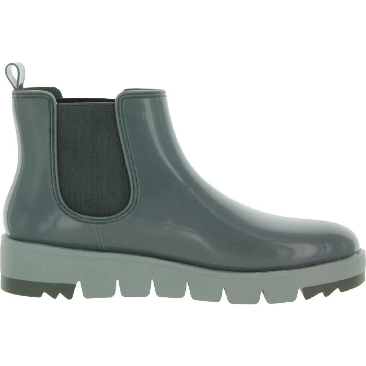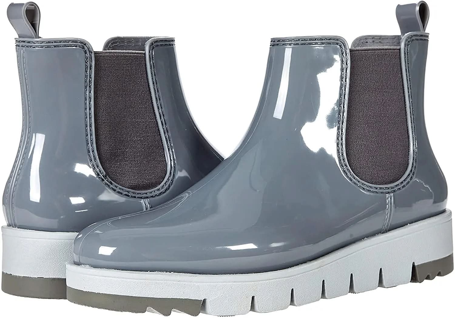 Ankle-high glossy Rubber-like compound Chelsea rain boot. Rounded toe. Double elastic gore closure. 1.25 inch wedge heel. Lightweight EVA cushion outsole with color pop inserts.