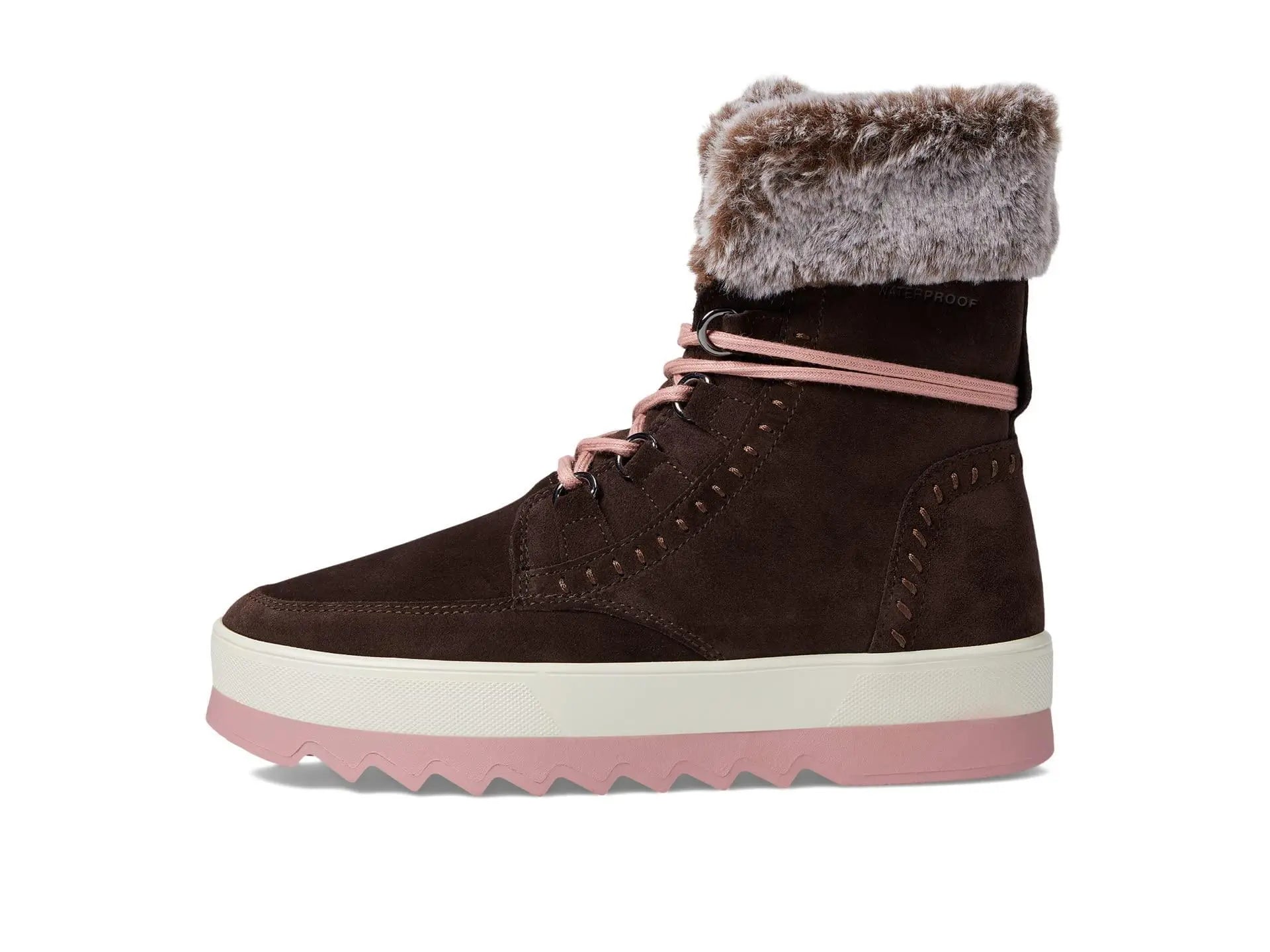Mid-calf slip on boot with faux fur collar. Rounded toe. Contrast front-lace closure with ankle wrap. Lightweight Thermoplastic rubber outsole with contrasting Polyurethane cushion midsole.