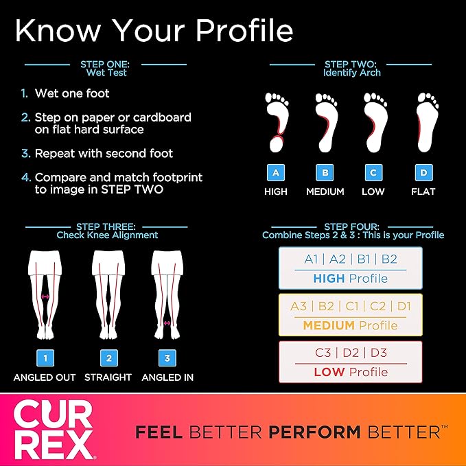 - DYNAMIC INSOLE SHOE INSERTS: Each CURREX premium insole boasts a different shape, arch height, and flex; allowing for a perfect, customized fit. Hit the green with GolfPRO insoles that have anatomic support and dynamic stability for pressure distribution.