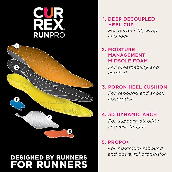 CURREX RUNPRO insoles were designed to enhance the comfort and fit of your running shoes and sneakers. Great for new and recreational runners, these athletic insoles provide sensational comfort with reduced fatigue, enhanced stability, and faster regeneration for better performance. Improve mile times and go the greater distance with the optimized movement and flexible arch support of CURREX dynamic insoles, the running insoles engineered to keep you running.