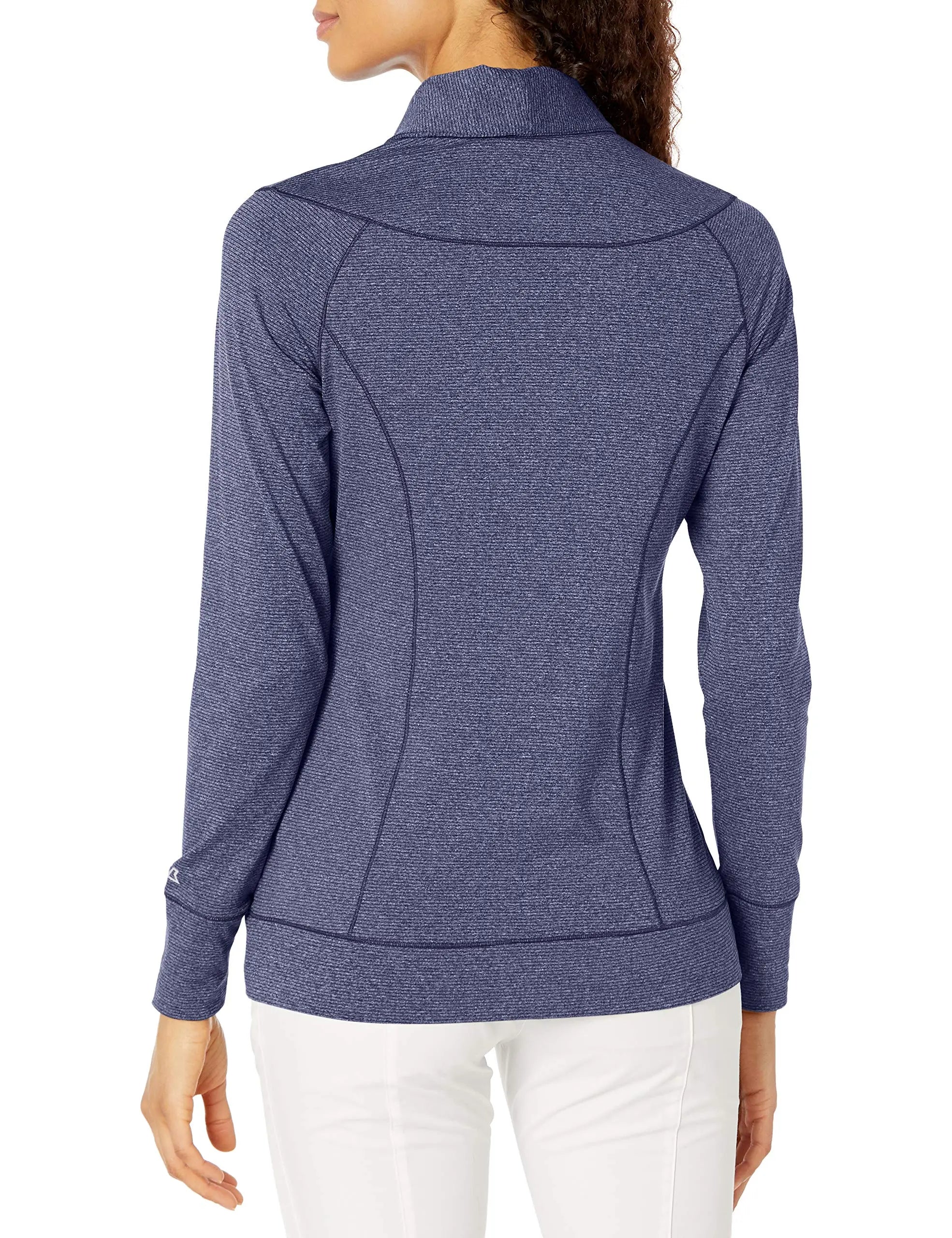- Half zip pullover with heather melange striping and asymetrical zip placket