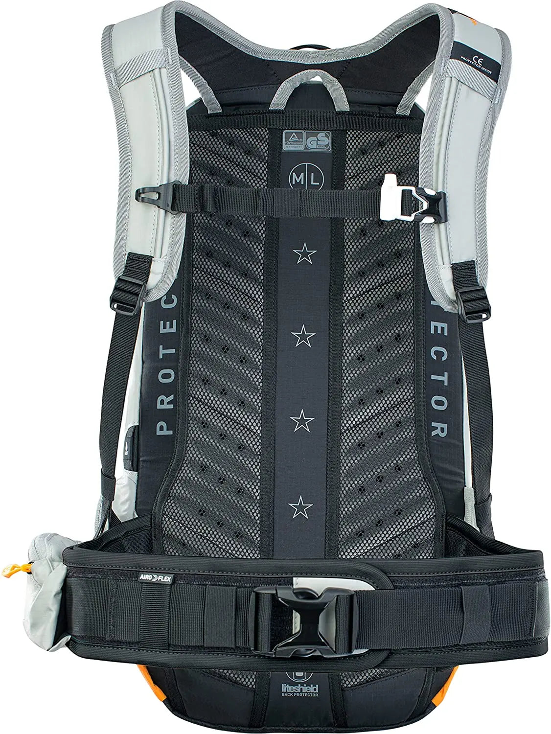 - Liteshield system air: Absolutely essential proximity of the protector to the body paired with the maximum of ventilation. The back portion is equipped with a large central ventilation channel and two rows of air vent lattices. EVA foam strips with ventilation holes and a special slanted pitch design reduce the contact area with the back and hereby provide additional air circulation. The extra wide, ergonomically formed hip belt is made of Airo flex.