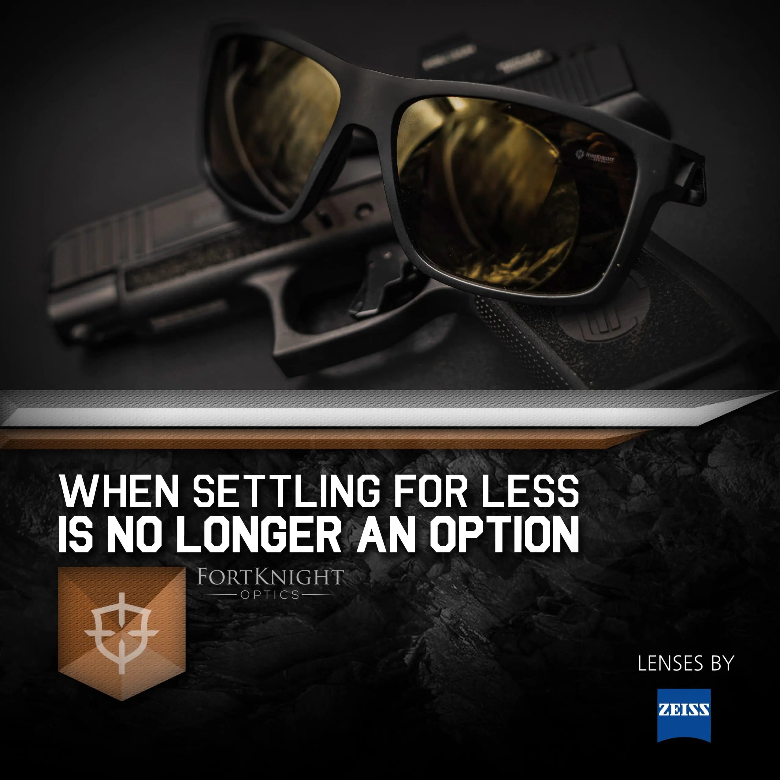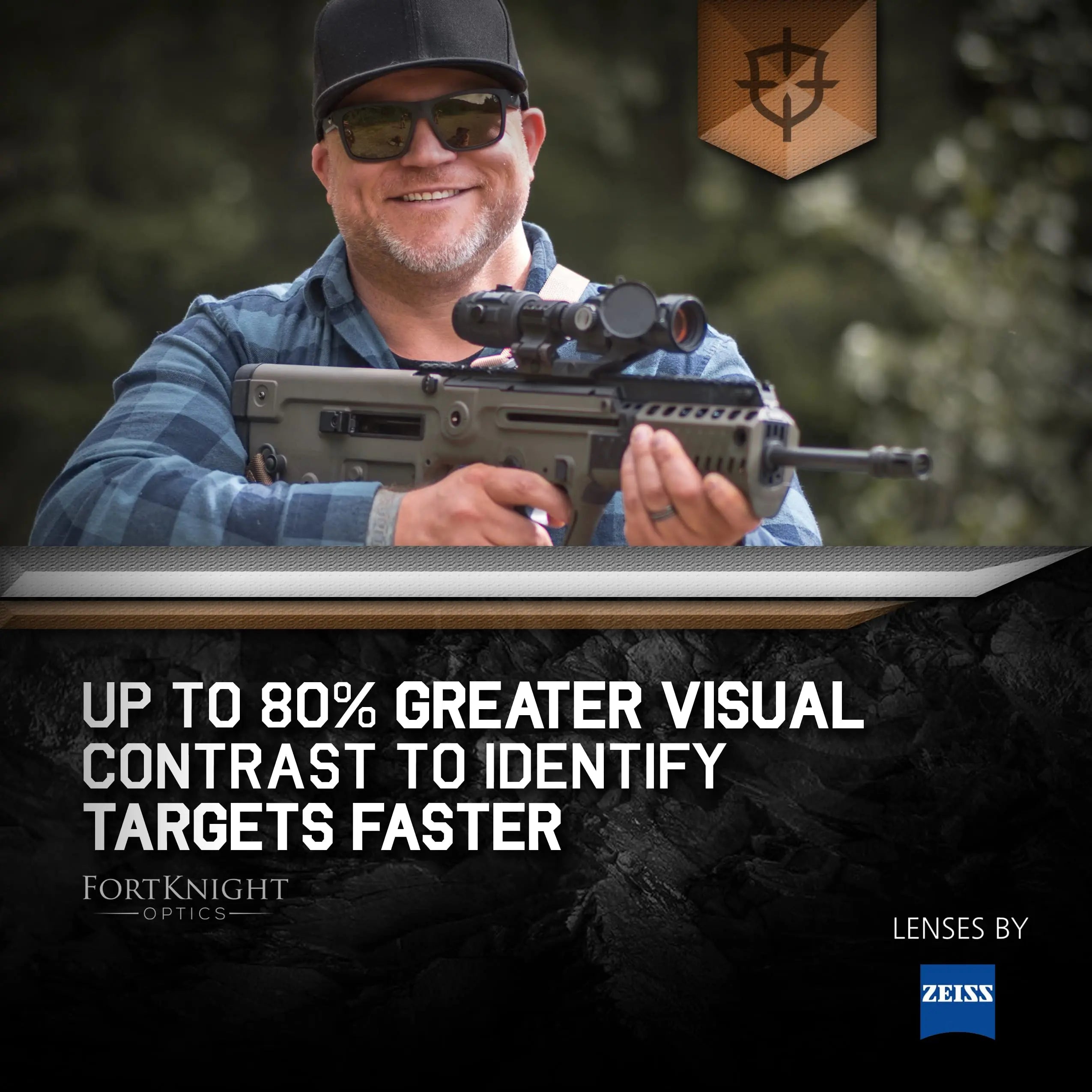 - LENSES BY ZEISS FortKnight Optics with ZEISS shooting eye protection glasses are anti-fog and designed to provide extreme clarity that is free from any artifacts. Eliminates distortion when looking through your riflescope or other glass. Up to 80% higher visual contrast means you can see and hit your target with greater accuracy.