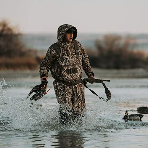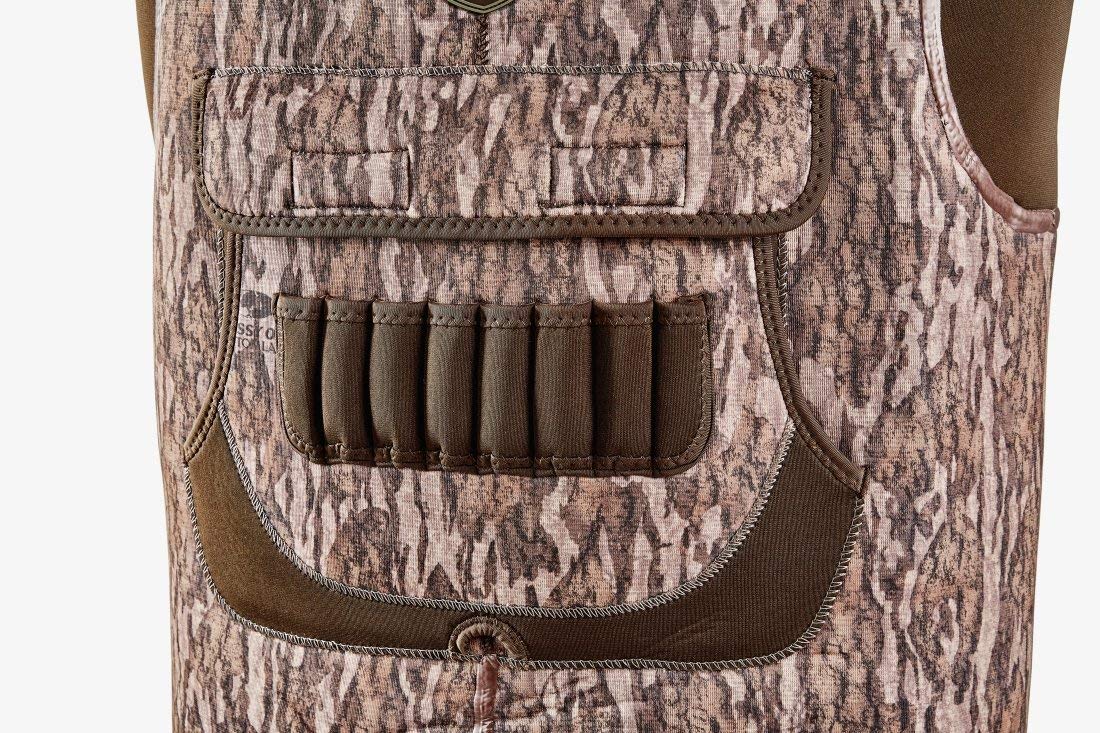 - USER FRIENDLY DETAILS - magnetic chest pocket for easy open and close. 6 shotgun shell holders. Fleece lined hand warmer pockets. 900D reinforced rear seat and leg gaiters prevents rips snags
