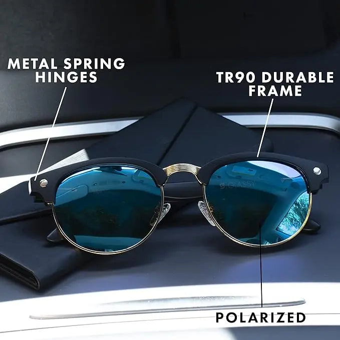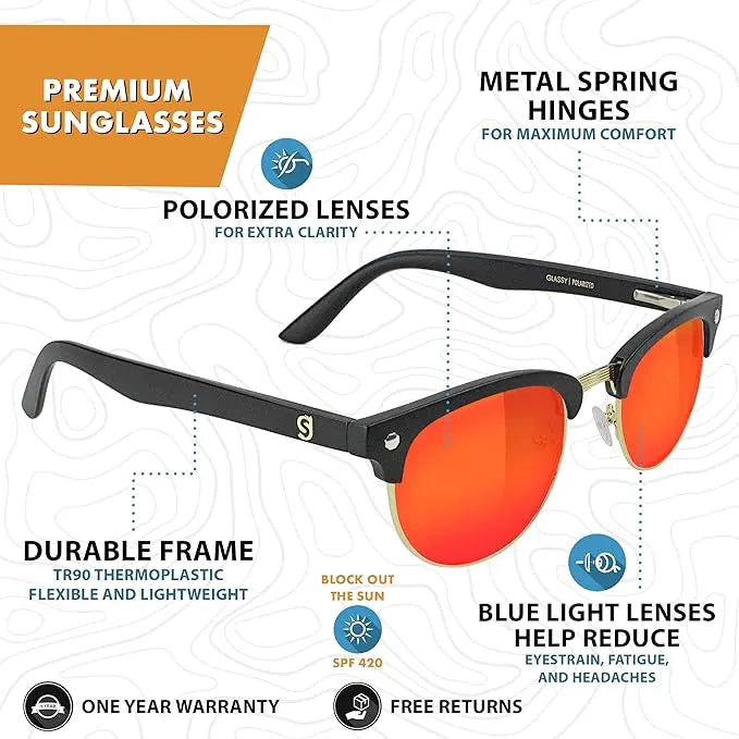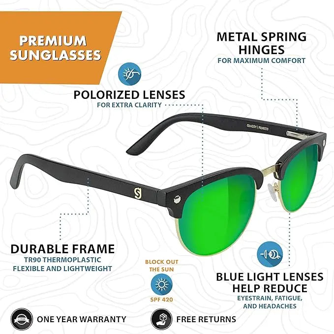 PROTECTION FOR YOUR EYES UNDER THE SUN Glassy Eye Wear has advanced our brand to focus on quality glasses that are dedicated to provide extreme protection to your eyes, so you can move freely and comfortably every day on your indoor and outdoor activities. Aside from gamer glasses, we also offer polarized sunglasses that filter out harmful UVA and UVB light that may cause long-term eye damage. Our fashion sunglasses for men and women are crafted from Swiss TR90 thermoplastic and half rim metal frames that feature CR-39 lens for maximum vision clarity. The active sunglasses securely fit the contour of your face and head to prevent any discomfort. Whether you want a peaceful walk at the park, relaxing sun bathing at the beach or driving experience, our classic style sunglasses are what you need. Product Features and Benefits: Handcrafted Swiss TR90 Thermoplastic with Half Rim Metal Frames CR-39 Lens With Anti- Reflective Coating for Extra Clarity UV Protected Polarized Glasses for Visual Comfort Metal Spring Hinges for Secure Fit Protects Eyes from Harmful UVA and UVB Rays Perfect for Outdoor Sports, Driving, and Travel Premium Protection Keep your eyes protected from the negative effects of prolonged exposure to the sun when you're outdoors. It features an advanced lens technology that blocks UVA and UVB light rays to ensure you enjoy your outdoor fun with family and friends without vision discomfort.