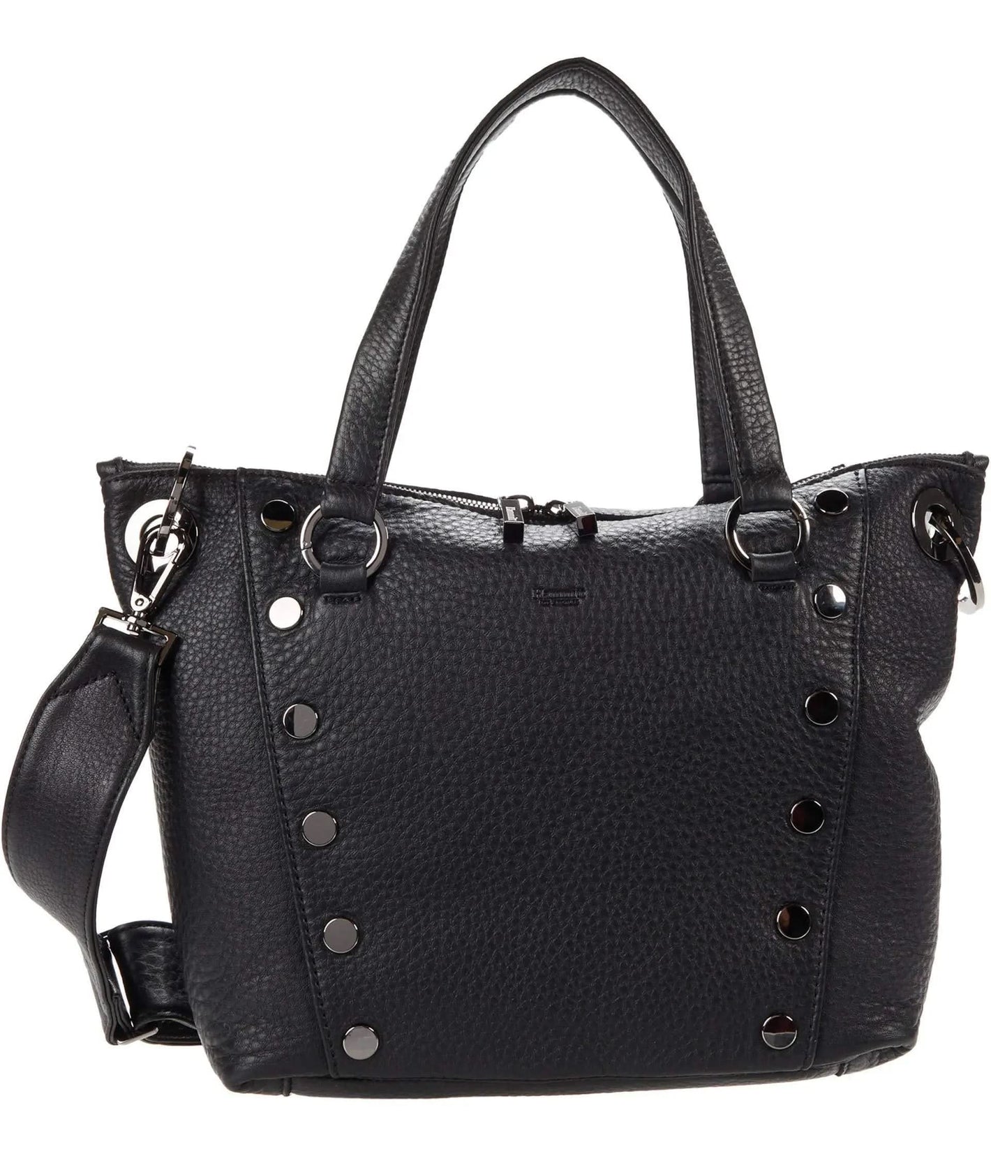The Hammitt Daniel Medium satchel is the perfect choice to embolden your trendsetting style with a slouchy design, decorative rivets along the front, and brushed finish hardware. Medium satchel is crafted from leather. Zipper closure with dual zip tabs. Dual carrying straps with a detachable, adjustable crossbody strap. Rear exterior slip pocket. Flat base provides an upright structure. Lined interior features a back-wall zip pocket and slip pockets.