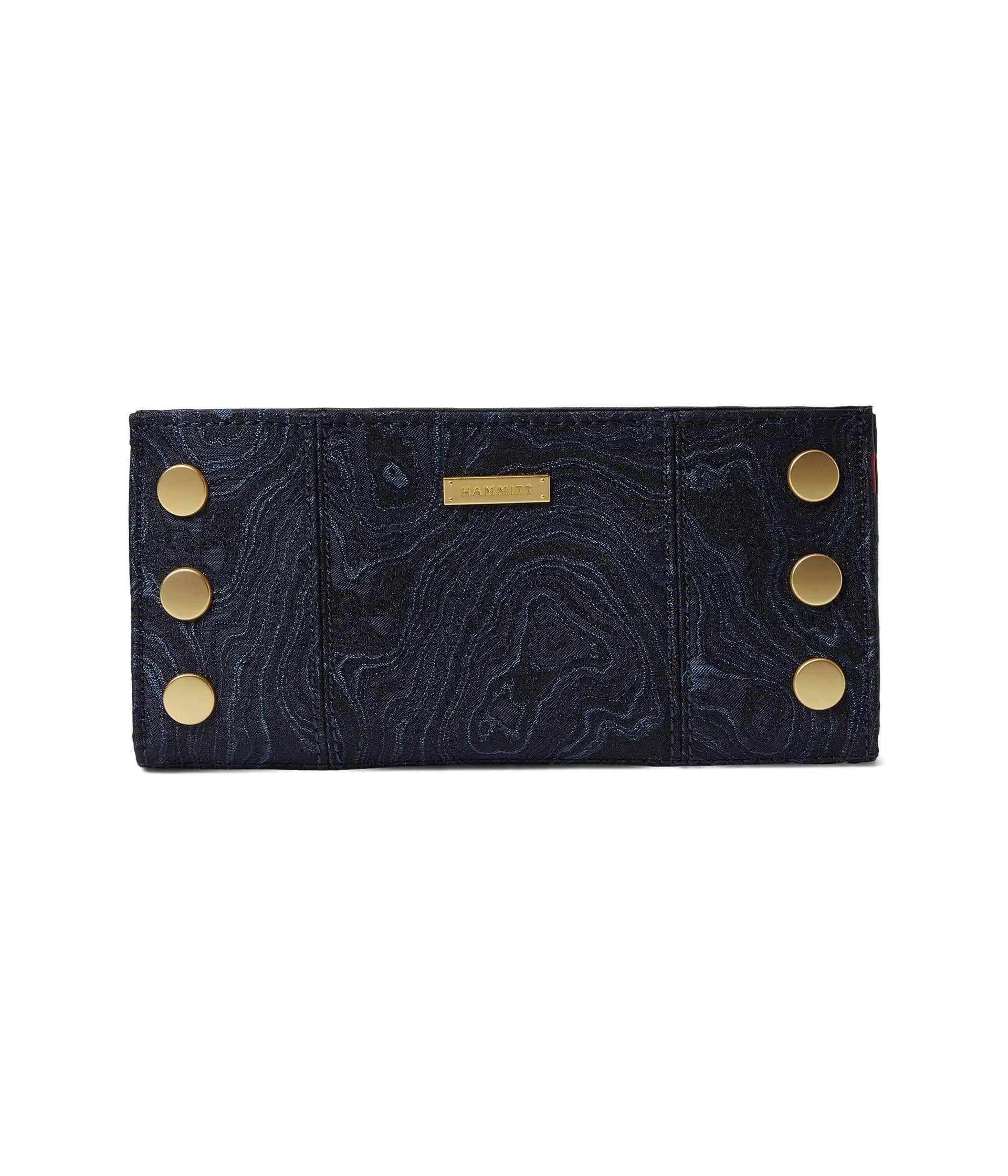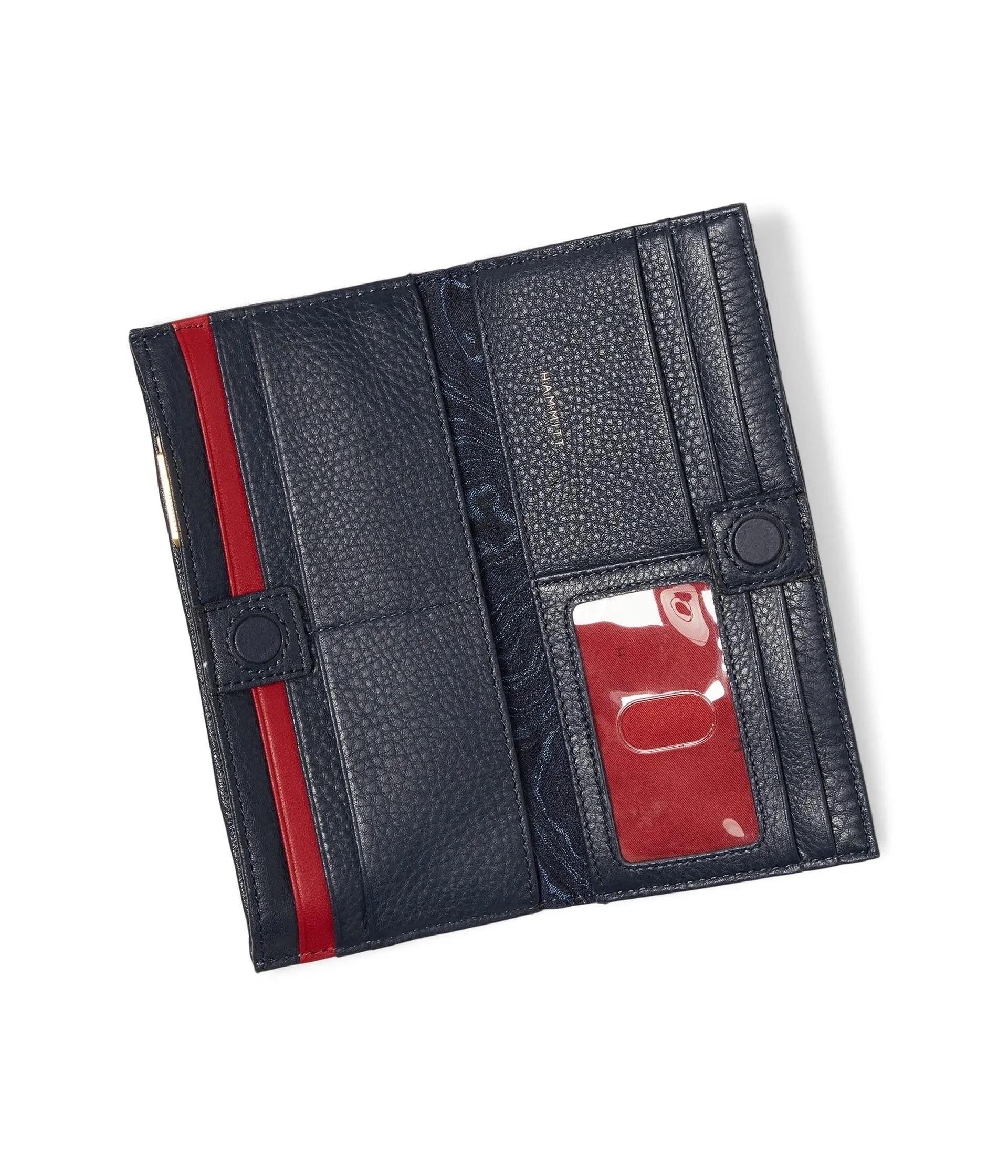 - Interior features two drop pockets, twelve credit card slots, and a clear id slot.