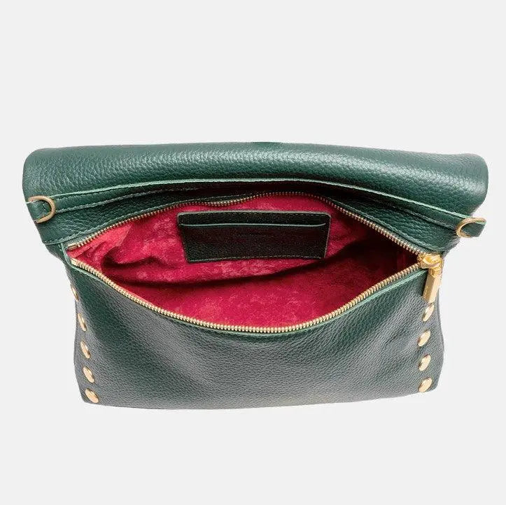 Signature fold-over flap with brushed gold zipper detail