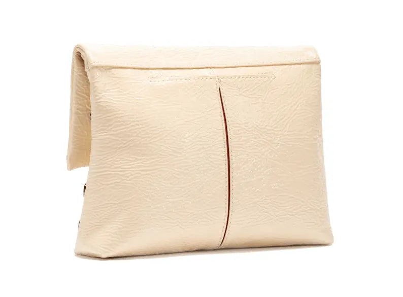 Because you're a VIP. Our all-time best-seller, this VIP clutch features an optional strap and subtle embossed rivets. From two zippered pockets to a credit card slot, two interior drop pockets, and an exterior phone pocket, this bag was designed with intention and organization in mind. Plus, you'll find a subtle strip of red peeking out along the bag's back seam. We're classy like that. Inspired by the soft varying shades of sculpted and chiseled natural stone, this Italian tumbled patent leather has a stunning shine with a textured wrinkle effect and a glimmer similar to waves reflecting the sun. Smooth to the touch, this cream-colored leather moves and drapes nicely without any stiffness, exuding a neutral tone that makes it a must-have staple.