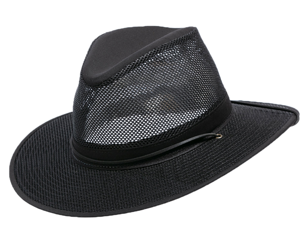 Stay shaded and stylish with the Black Aussie, a durable wide-brim hat designed for outdoor enthusiasts. Crafted in the USA, this hat features a generous 3-inch brim to shield your eyes from harsh sunlight while maintaining a lightweight, breathable feel. Completely packable and crushable, the Black Aussie is easy to store and carry, making it perfect for hiking, fishing, camping, or any adventure. It combines premium fabrics with ventilating mesh panels for all-day comfort and airflow. A chin cord ensures a secure fit, even on windy days, while the 1-inch self-band allows the hat to fold neatly for travel. Inside, the unlined crown with a soft sweatband keeps you cool and comfortable no matter the conditions. This versatile hat is the ultimate companion for anyone seeking both sun protection and convenience in the great outdoors.