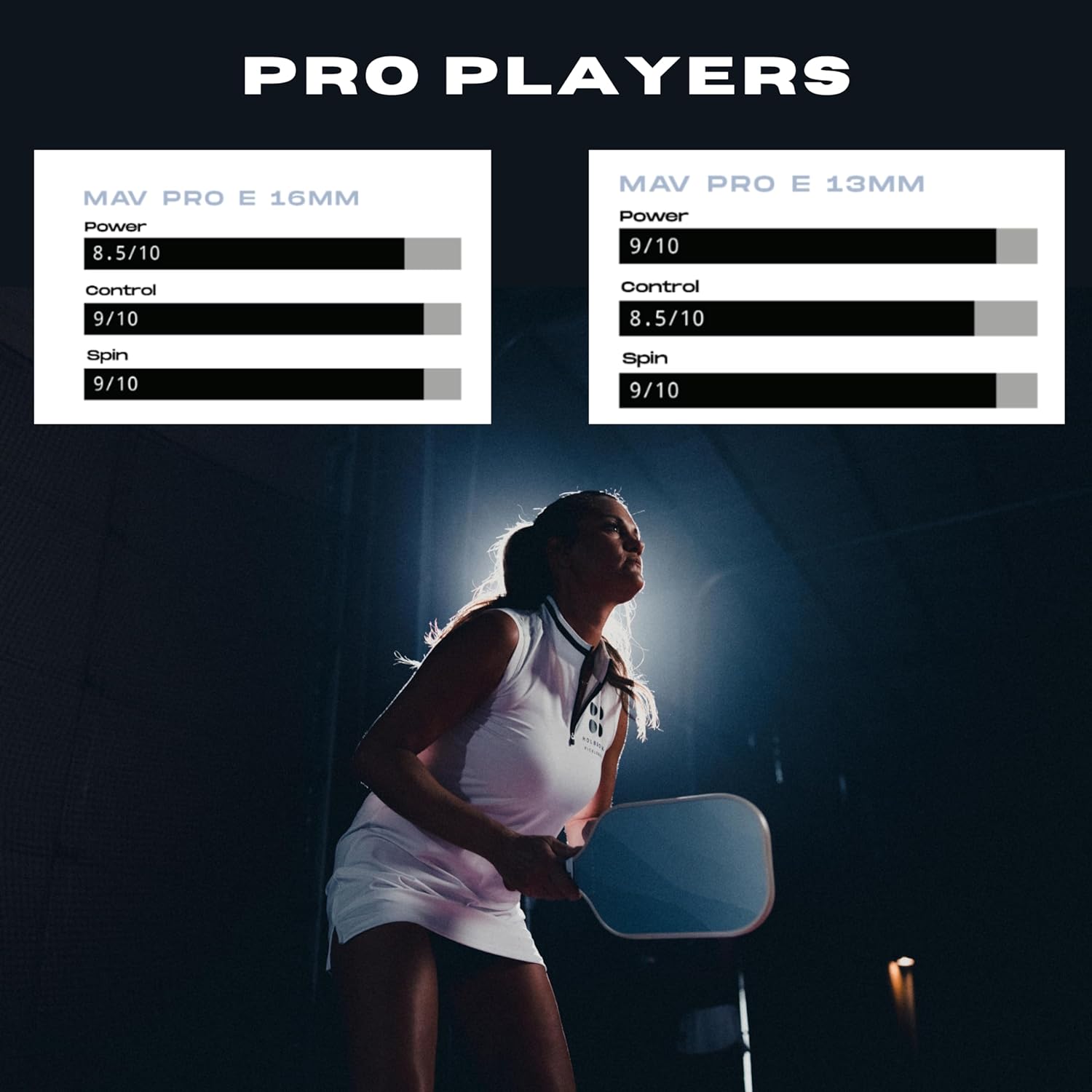 - POWER, SPIN, SPEED, CONTROL: Being part of our Pro Series, we engineered the Mav Pro E paddle to give you the best combination of power, spin, speed, & control. Specs: 16.5" H x 7.5" W. Weight: 7.7-8.0 oz.