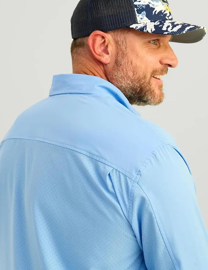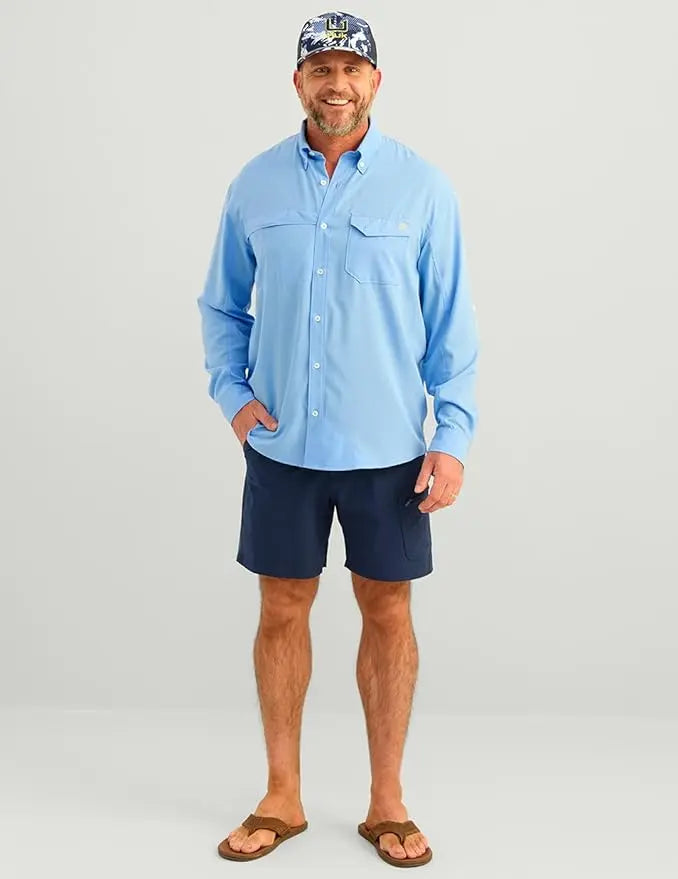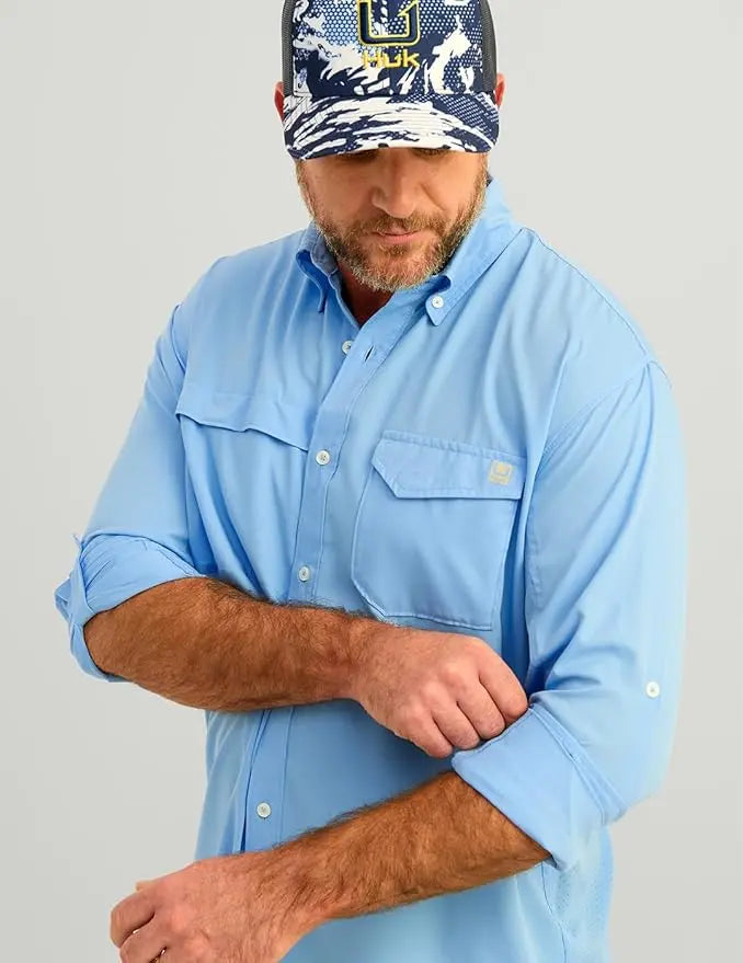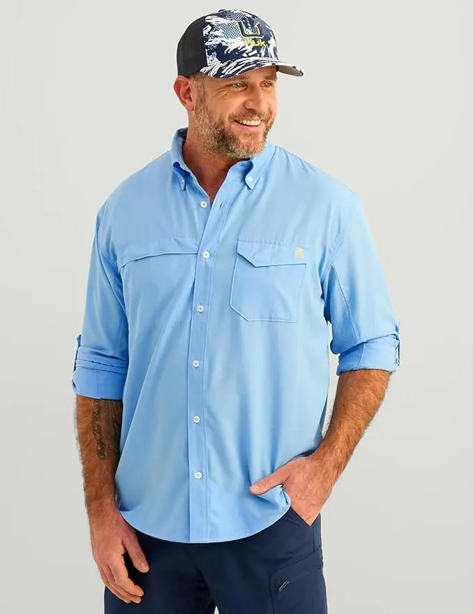- MOISTURE TRANSPORT: Huk's hydrophobic, or “water-hating” quality within the fibers of this fishing button down, transport the sweat away from the skin to the exterior of the shirt where it can evaporate more efficiently
