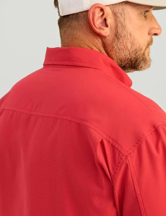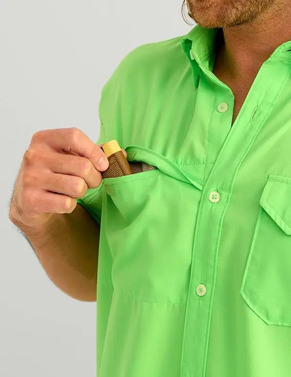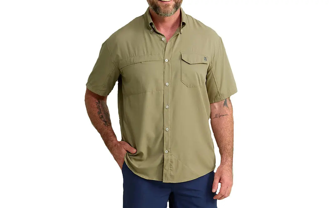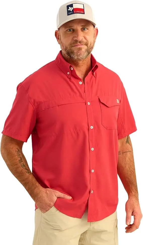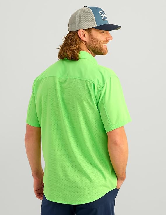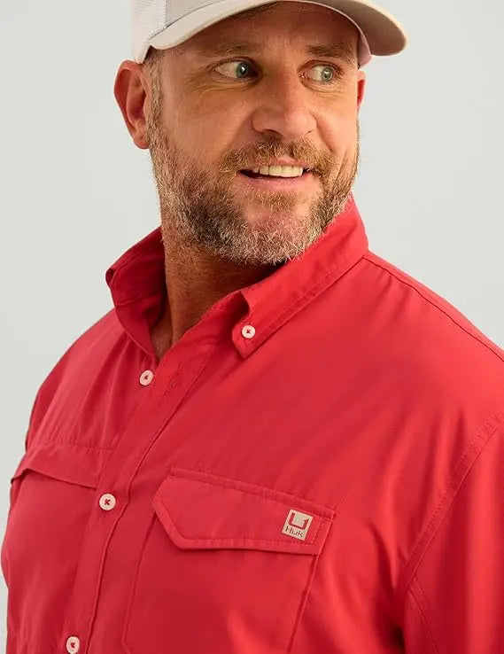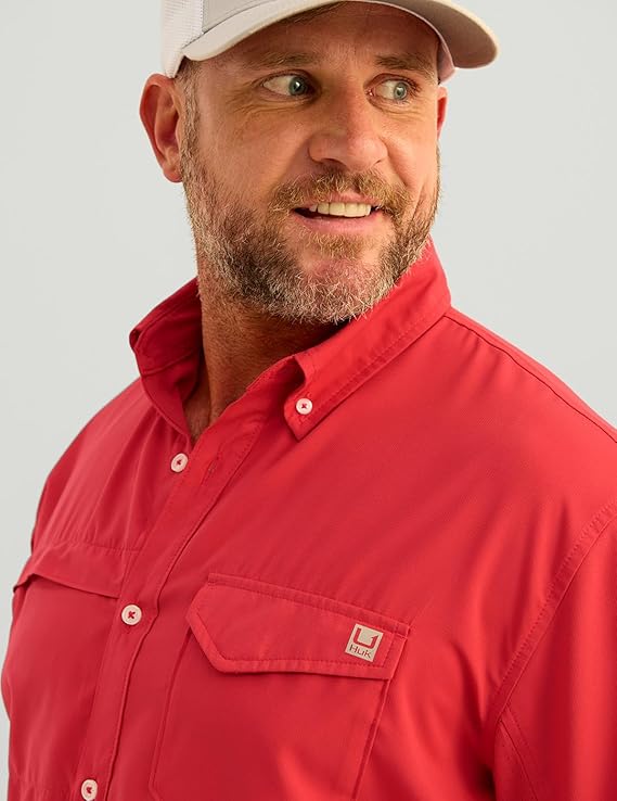 - MOISTURE TRANSPORT: Huk's hydrophobic, or “water-hating” quality within the fibers of this fishing button down, transport the sweat away from the skin to the exterior of the shirt where it can evaporate more efficiently