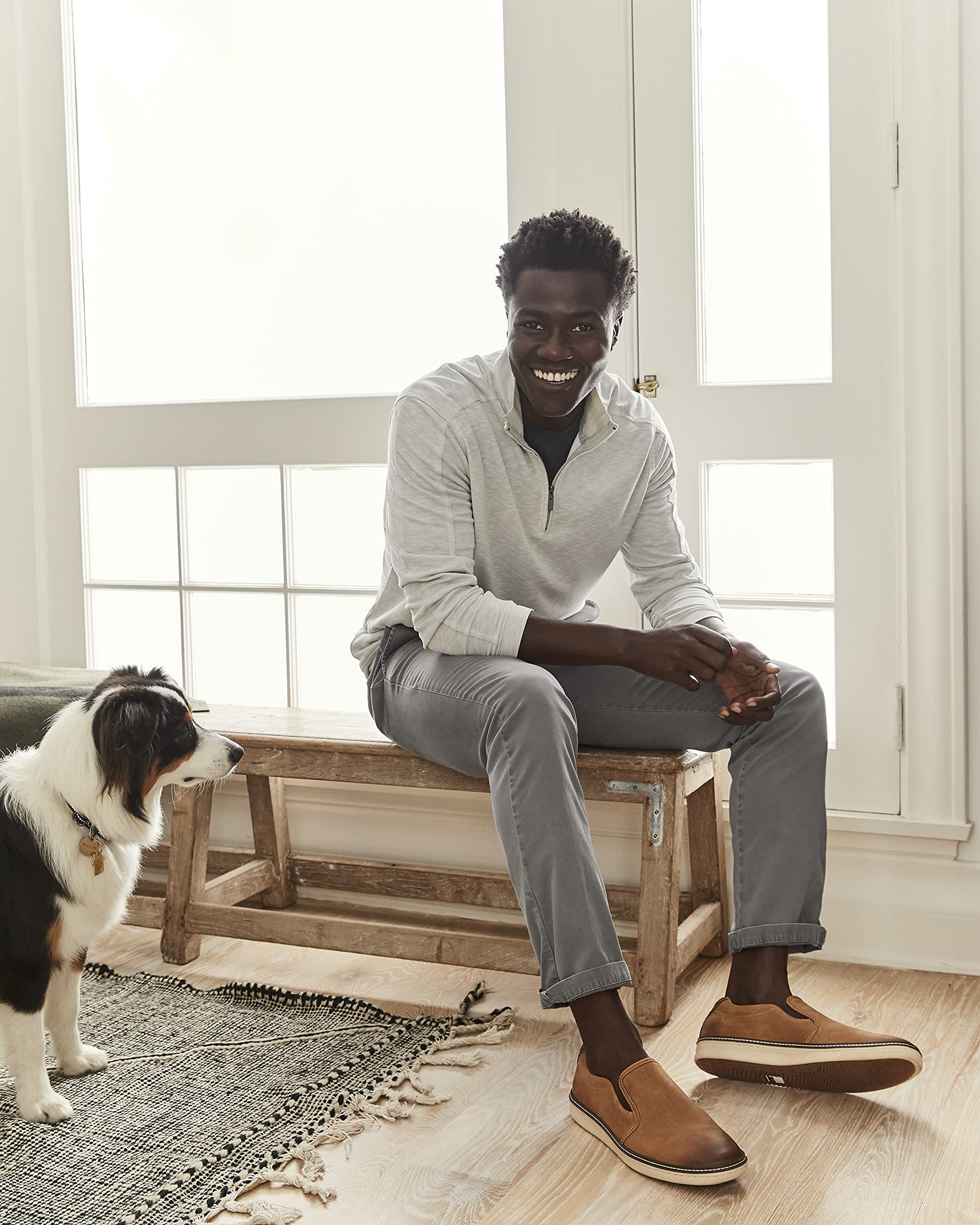 - OPTIMUM CUSHIONING: For your busiest days, these men's leather shoes feature a cushioned footbed with leather/performance-fabric covering for all-day comfort. The slip-on styling and padded collar ensure easy and comfortable wearing.